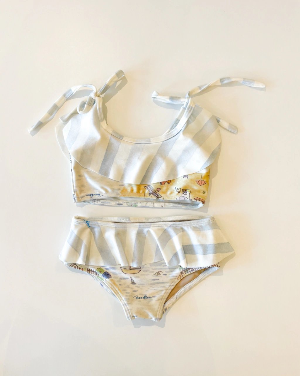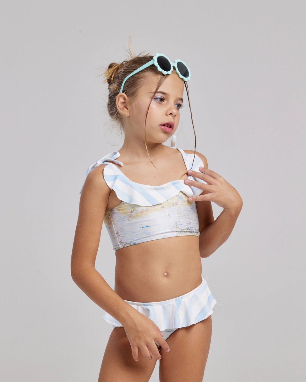 Este conjunto de biquíni infantil é a escolha perfeita para os dias de sol e diversão. Confeccionado em poliamida de alta qualidade, com uma estampa azul praia, ele combina estilo e conforto. O biquíni tem alcinhas com amarração e babadinhos na calcinha e top. Além disso, a proteção UV 50+ garante segurança contra os raios solares, enquanto o forro 100% garante maior conforto e cobertura.