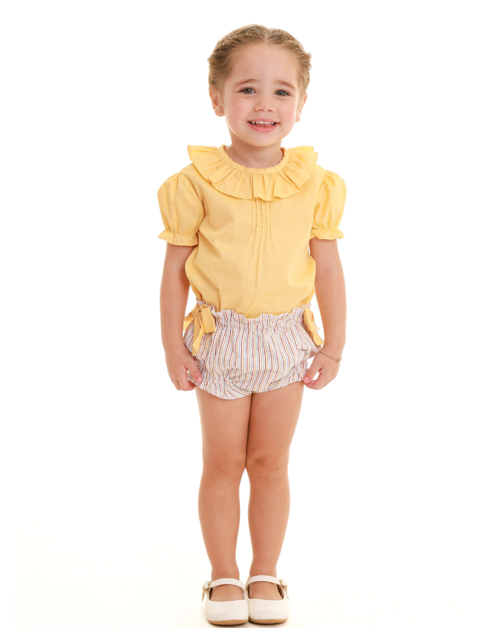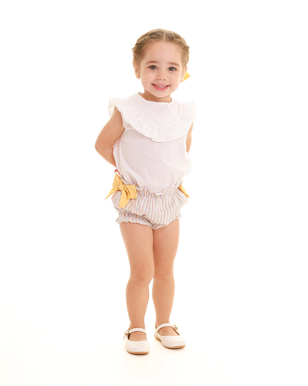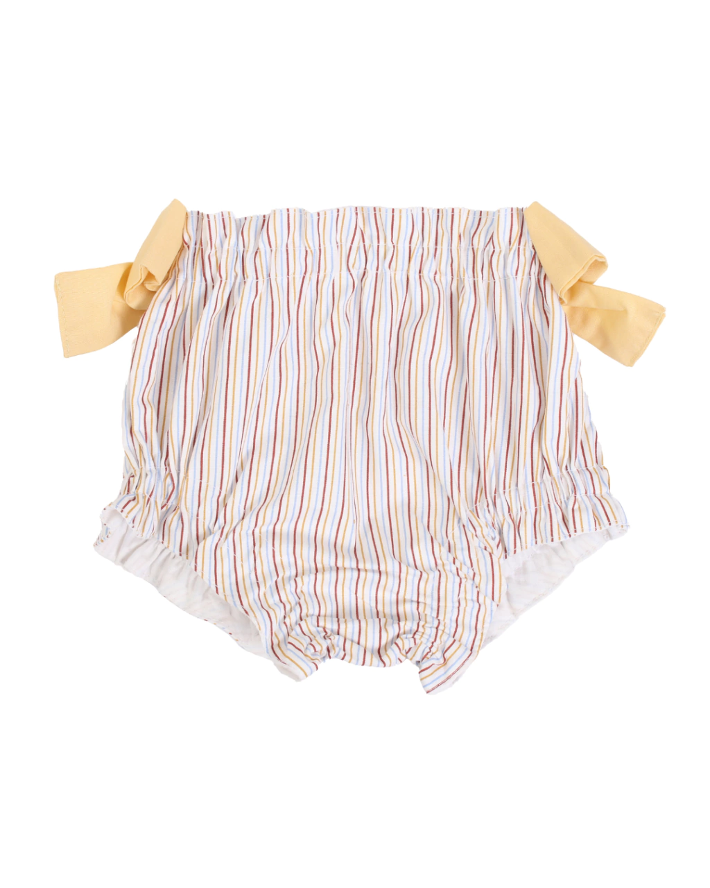 Cheio de charme e praticidade, o bloomer é uma peça indispensável no guarda-roupa dos pequenos. Esse modelo traz estampa listrada em tons suaves e detalhe de lacinhos laterais em amarelo, que dão um toque delicado e alegre à peça.