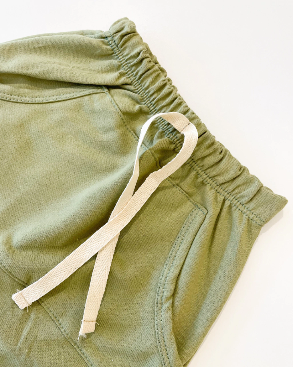Nas cores off white e verde oliva, tem design minimalista, bolsos frontais funcionais e cordão decorativo na cintura. A barra dobrada dá um toque charmoso e atemporal, combinando com todos os looks do dia a dia.