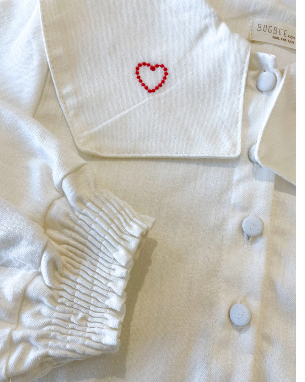 O destaque fica por conta da gola ampla estilo babador, com um bordado de coração vermelho que adiciona um detalhe sutil e amoroso à peça. Os botões frontais e o punho com elástico franzido nas mangas garantem praticidade e um caimento confortável.