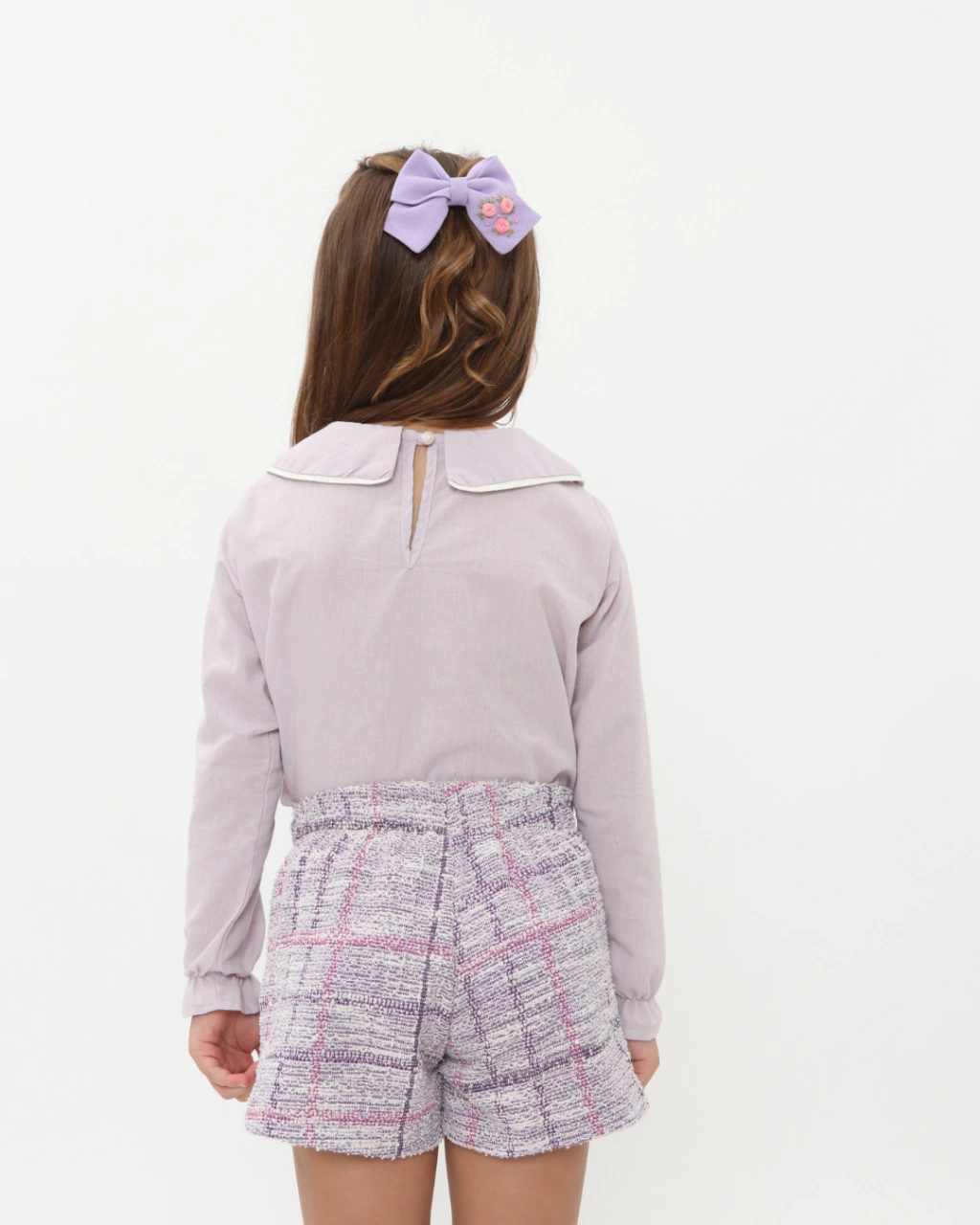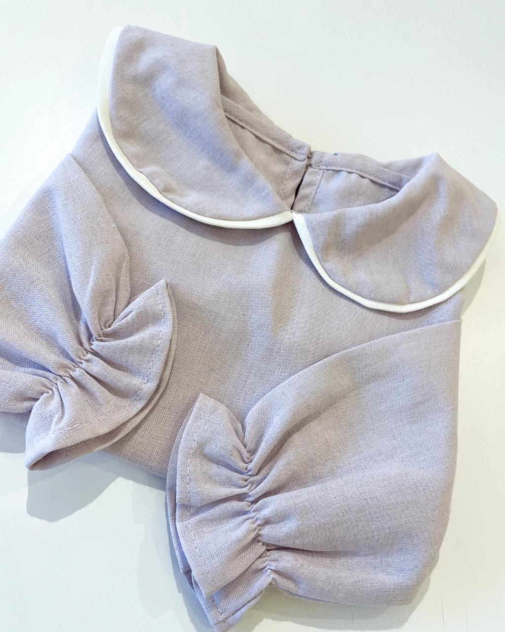 A blusa Liz é super confortável. Ela tem modelagem mais soltinha, elástico bem molinho nas mangas, formando um detalhe de babadinhos nos punhos, e gola redonda com friso off-white. O fechamento é nas costas com botão de resina ecológica. Fica linda quando usada sozinha ou por baixo de outras peças.