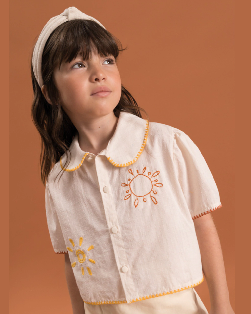 O destaque fica por conta dos bordados em forma de sol, em tons de amarelo e laranja, que dão um ar lúdico e alegre à peça. O acabamento em ponto caseado colorido na gola, barra e mangas reforça o cuidado em cada detalhe.