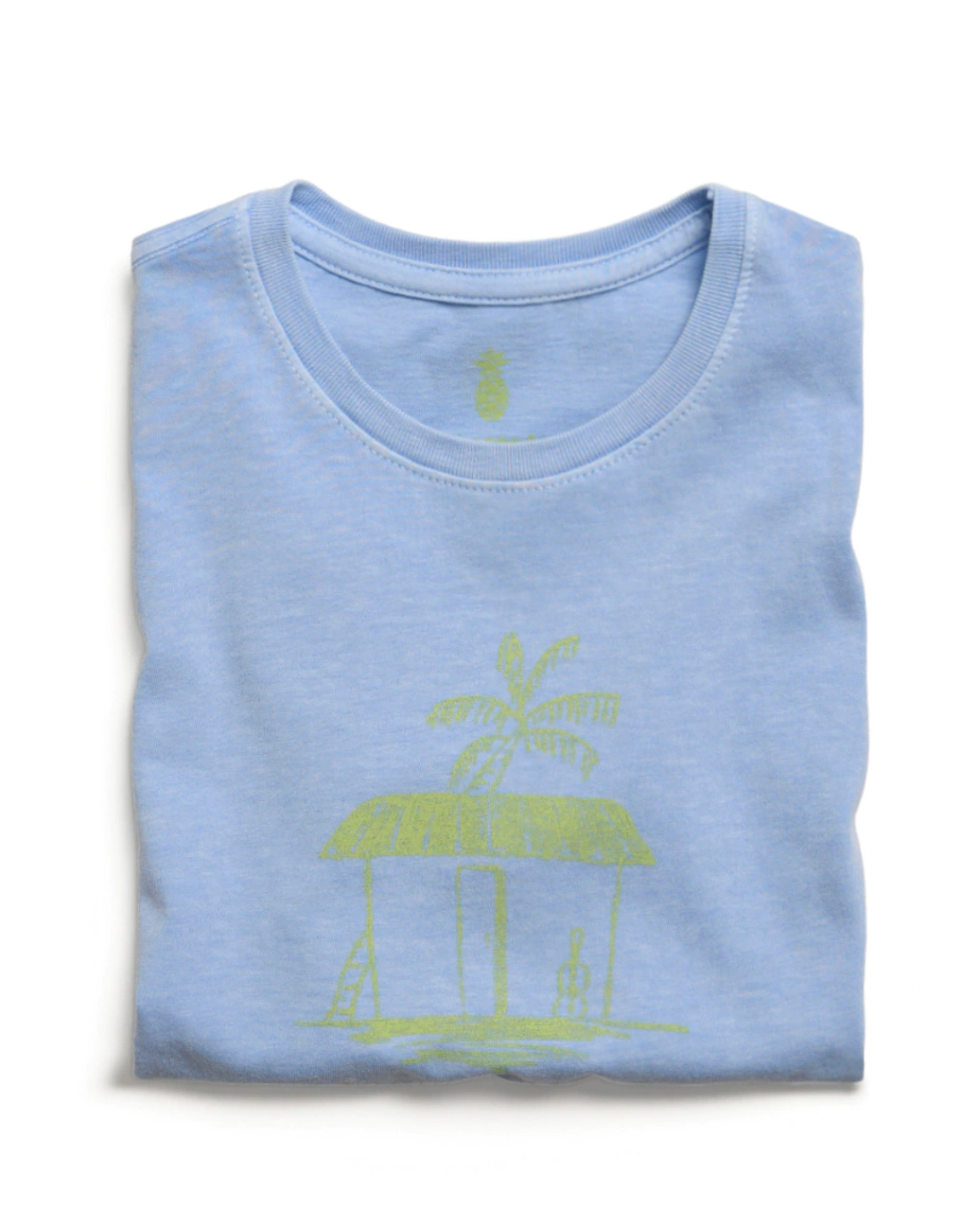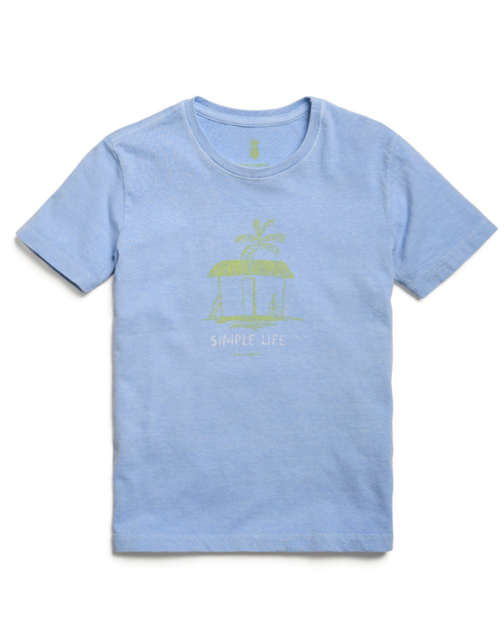 Em tom azul suave, é confeccionada em malha macia e respirável, garantindo conforto no dia a dia. A estampa em verde traz uma cabana à beira-mar com coqueiro e a frase “Simple Life”, que transmite a leveza e o estilo de vida praiano.
