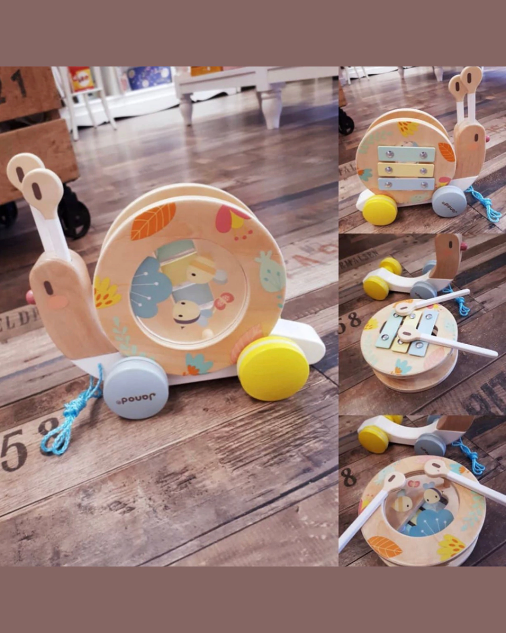 A concha do caracol é removível e se transforma em um xilofone musical, além de conter engrenagens giratórias que despertam a curiosidade e estimulam a coordenação motora. O brinquedo acompanha duas baquetas e uma cordinha para puxar, incentivando o bebê a engatinhar e explorar.