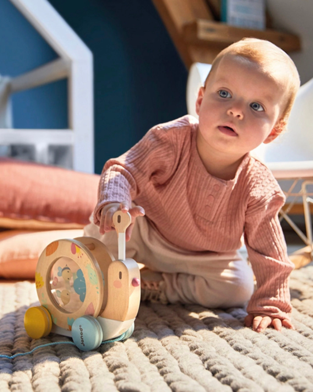 Este caracol de madeira da marca francesa Janod é um verdadeiro companheiro de descobertas para os pequenos. Com design lúdico e cores suaves, ele é ao mesmo tempo um brinquedo de puxar e um centro de atividades sensoriais.