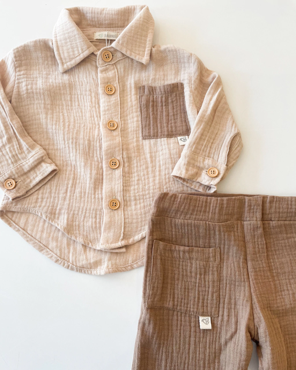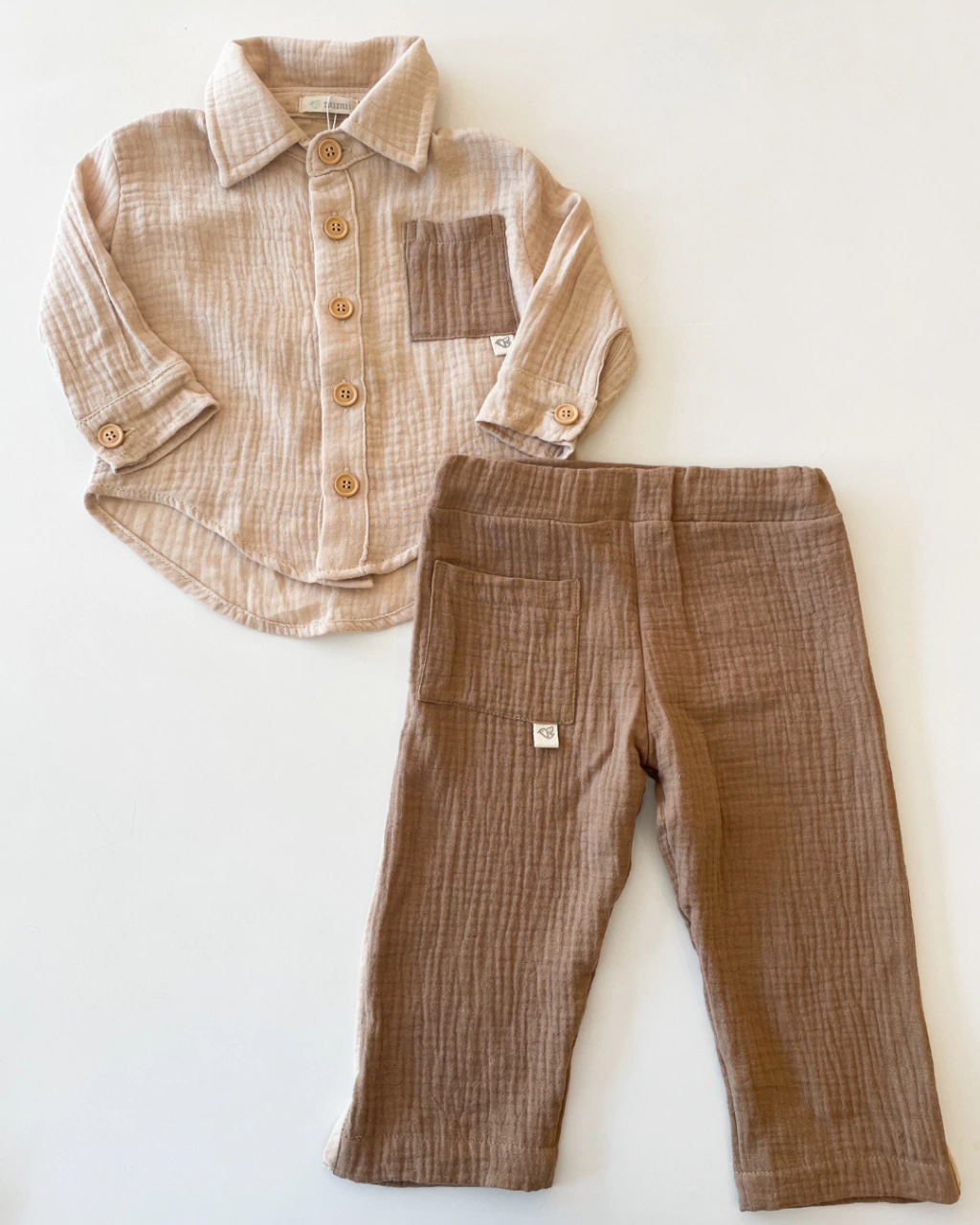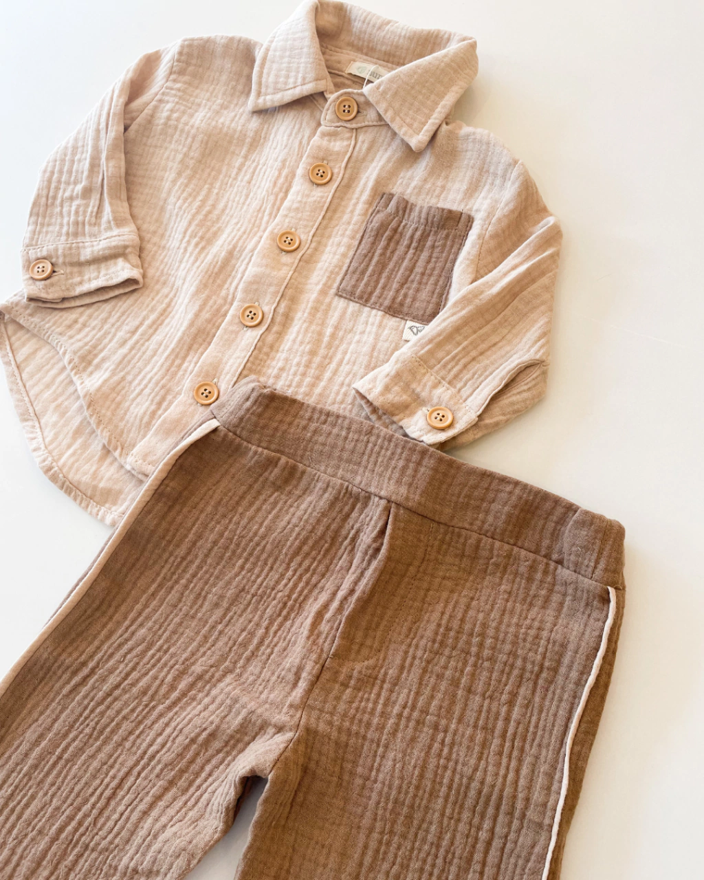 O Conjunto Antônio é confeccionado em tecido gaze 100% algodão, conhecido por sua leveza, maciez e conforto, ideal para a pele delicada das crianças.