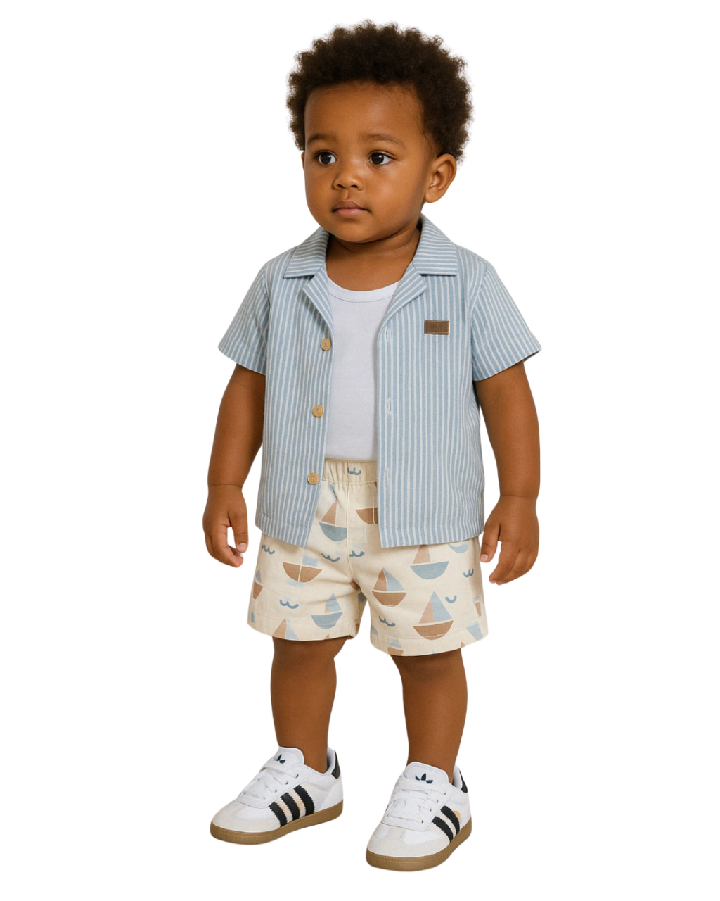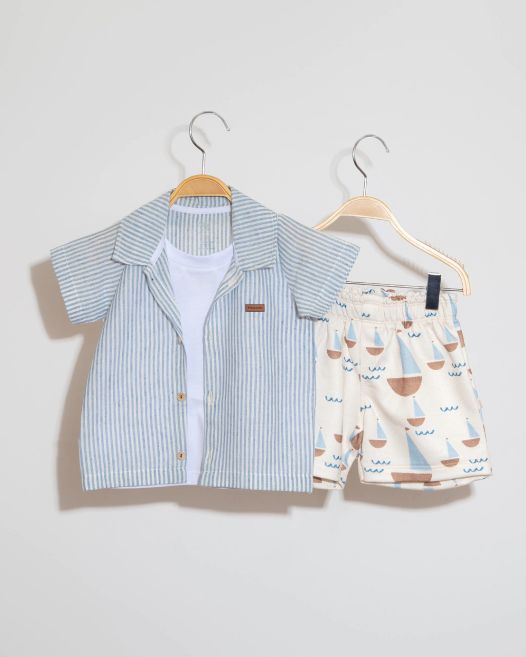 A camisa em listras azul e branco acompanha camiseta branca por baixo, criando um visual moderno e leve para o verão. O destaque fica por conta do short com estampa de barquinhos em tons suaves, trazendo um toque divertido e delicado ao look. Feito com tecidos leves e confortáveis, é perfeito para passeios à beira-mar ou dias ensolarados com muito estilo e liberdade.