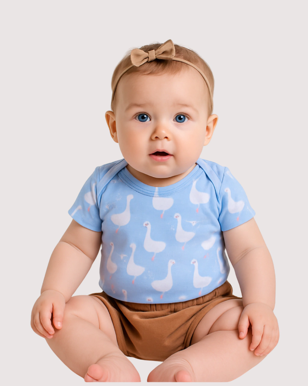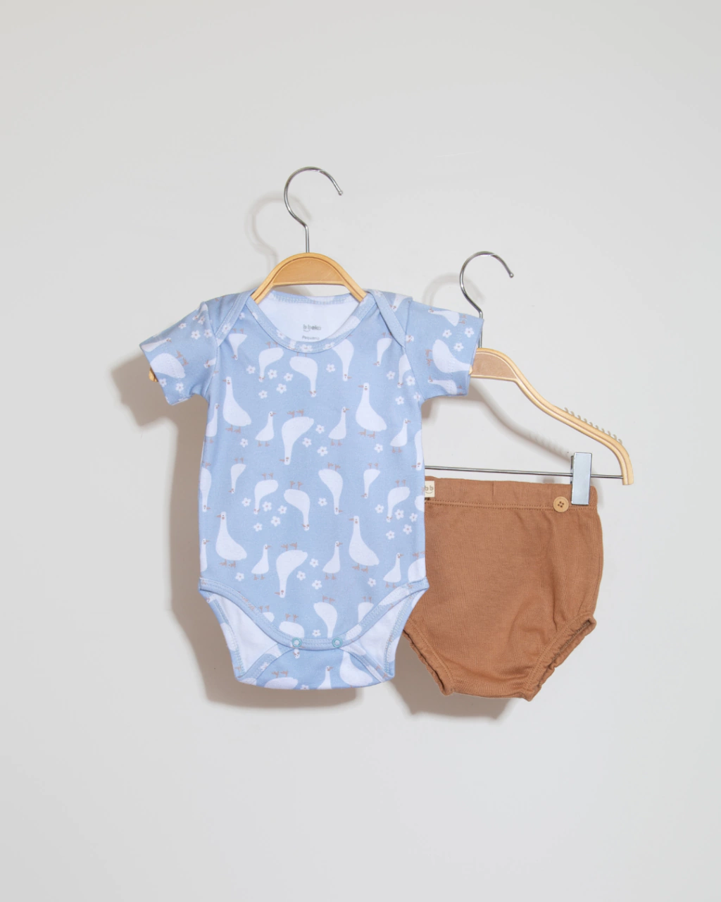 Esse conjunto é composto por um body em suedine fio egípcio, com toque ultra macio, ideal para a pele delicada do bebê. Acompanha uma tapa-fraldas em suedine com estampa full print de patos, divertida e cheia de personalidade.
