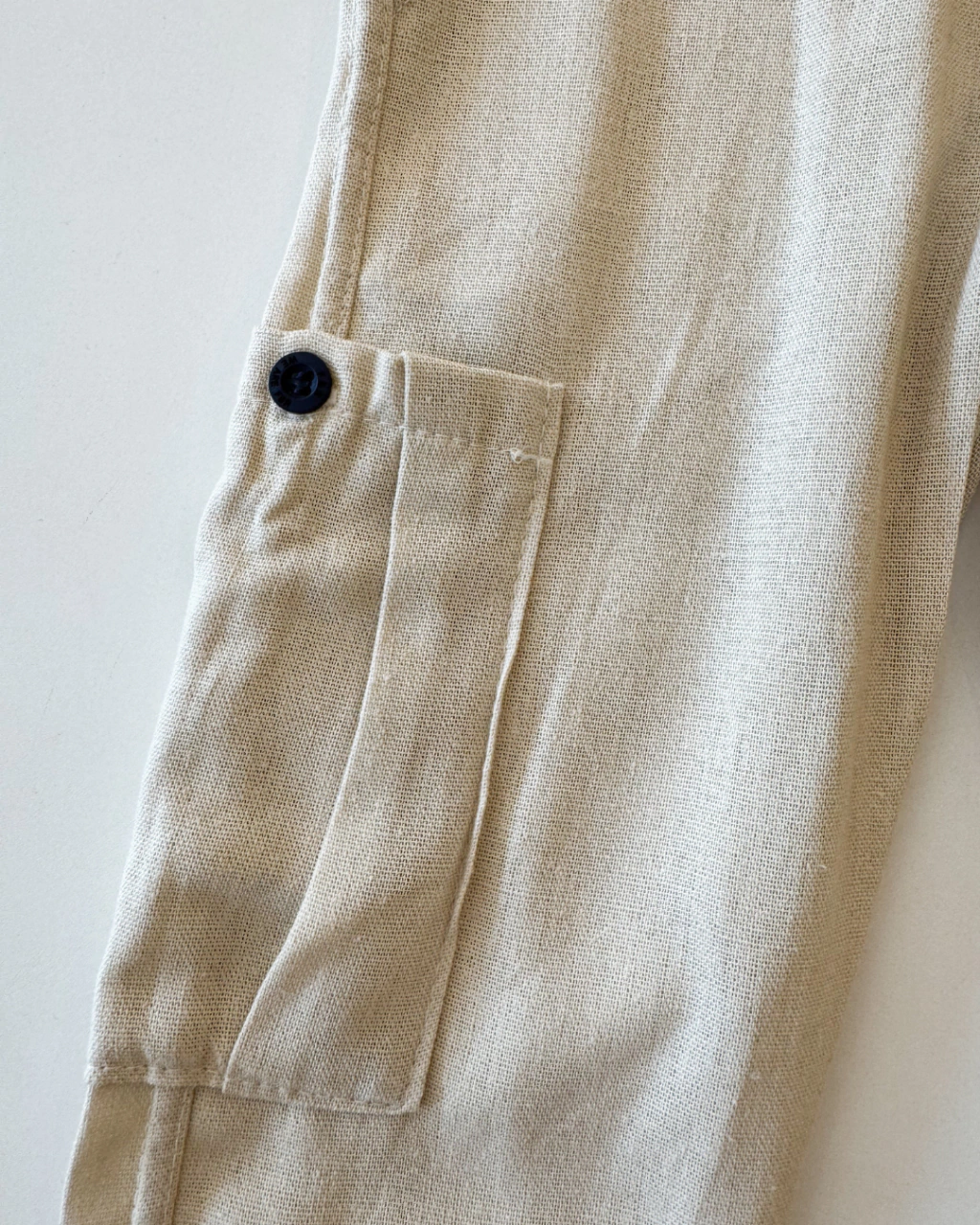 A calça bege complementa perfeitamente o visual, com modelagem confortável, elástico na cintura e amarração ajustável, além de bolsos funcionais, incluindo um lateral com botão. Feita em tecido leve e macio, proporciona liberdade de movimento para as brincadeiras do dia a dia.