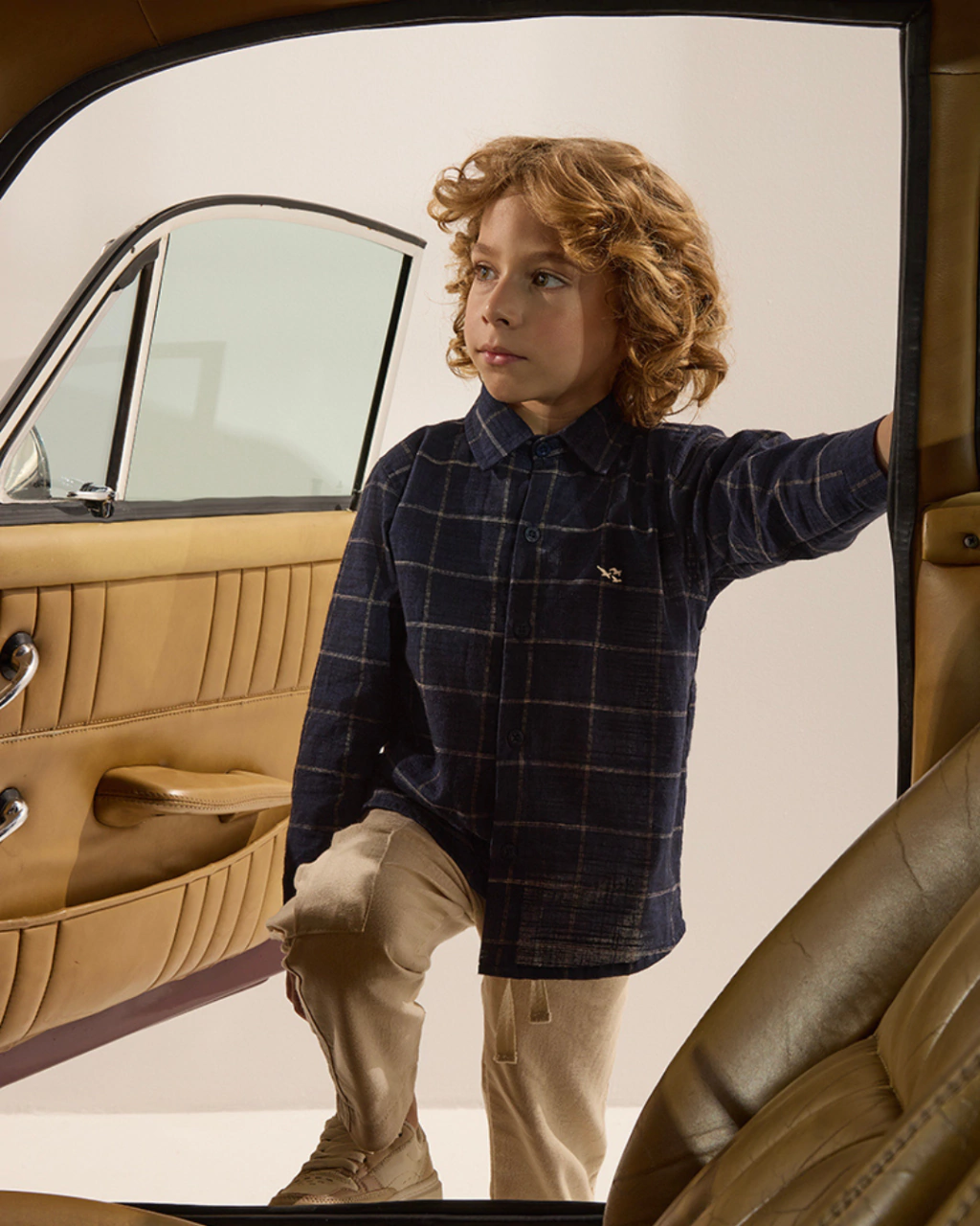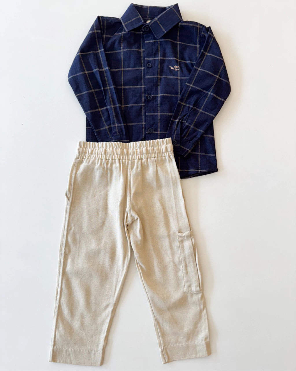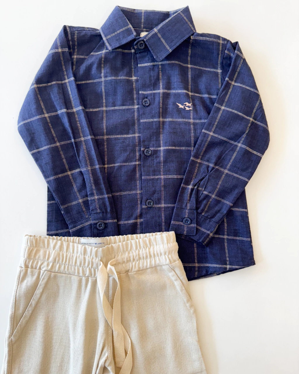 Um look cheio de estilo e conforto para os pequenos! Este conjunto é composto por uma camisa de manga longa azul marinho com estampa xadrez clássica e discreta, ideal para ocasiões especiais ou passeios em família. A camisa conta com fechamento por botões e bordado delicado no peito, trazendo um toque sofisticado.