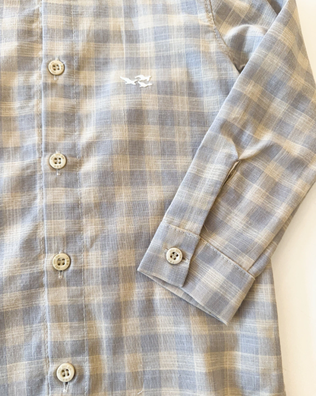 Com um toque clássico e moderno, este conjunto infantil é ideal para deixar os pequenos elegantes e confortáveis em qualquer ocasião! A camisa possui estampa xadrez suave em tons de bege e azul, além de gola padre, que confere um estilo diferenciado e atual. O fechamento frontal por botões facilita na hora de vestir, e o bordado delicado no peito adiciona charme à peça.
