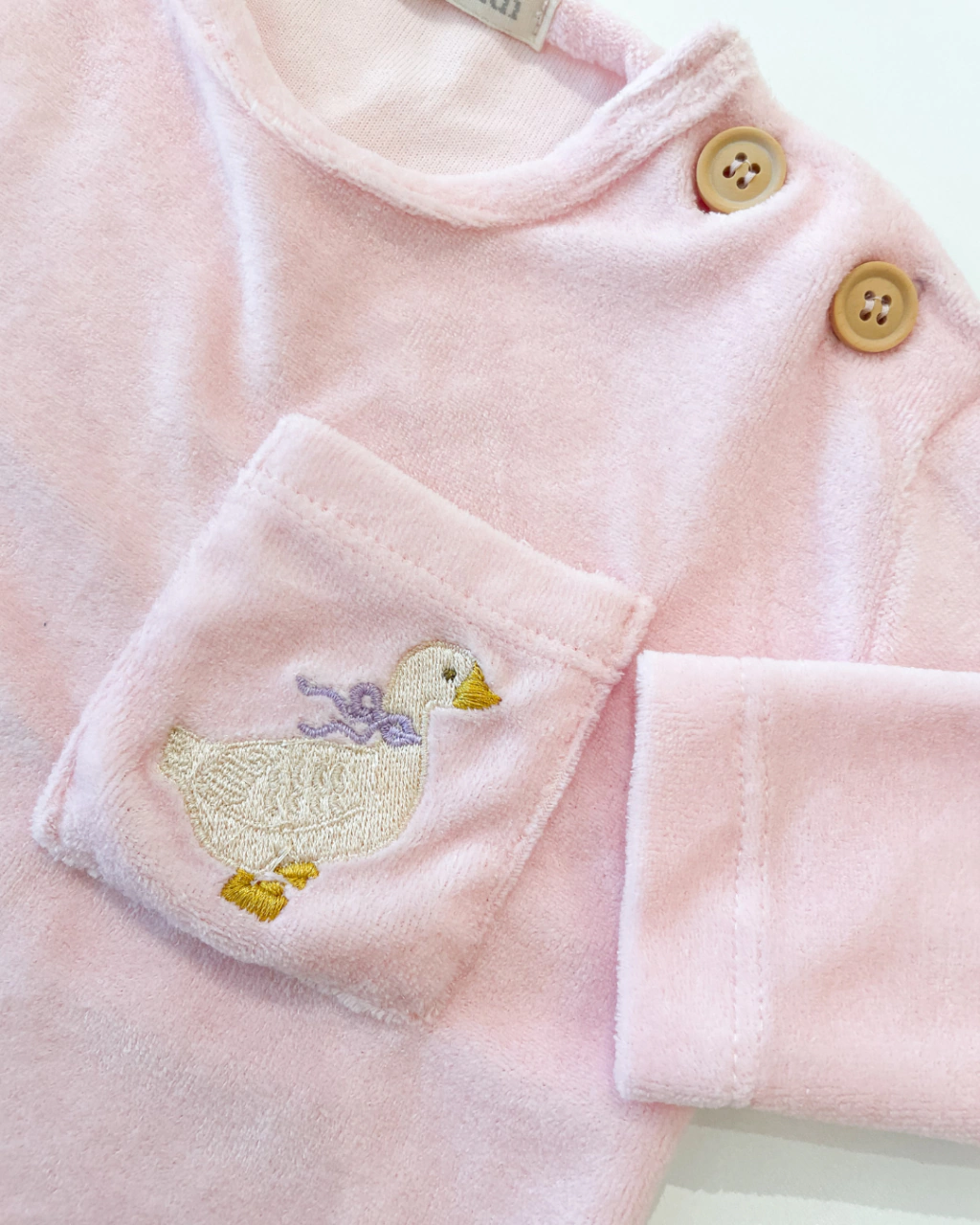 Blusa de manga longa em tom rosa bebê, com modelagem reta e leve arredondado na barra. Possui botões no ombro, que facilitam na hora de vestir, além de um bolsinho frontal bordado com uma charmosa gansa com laço lilás, adicionando um toque lúdico e feminino à peça.