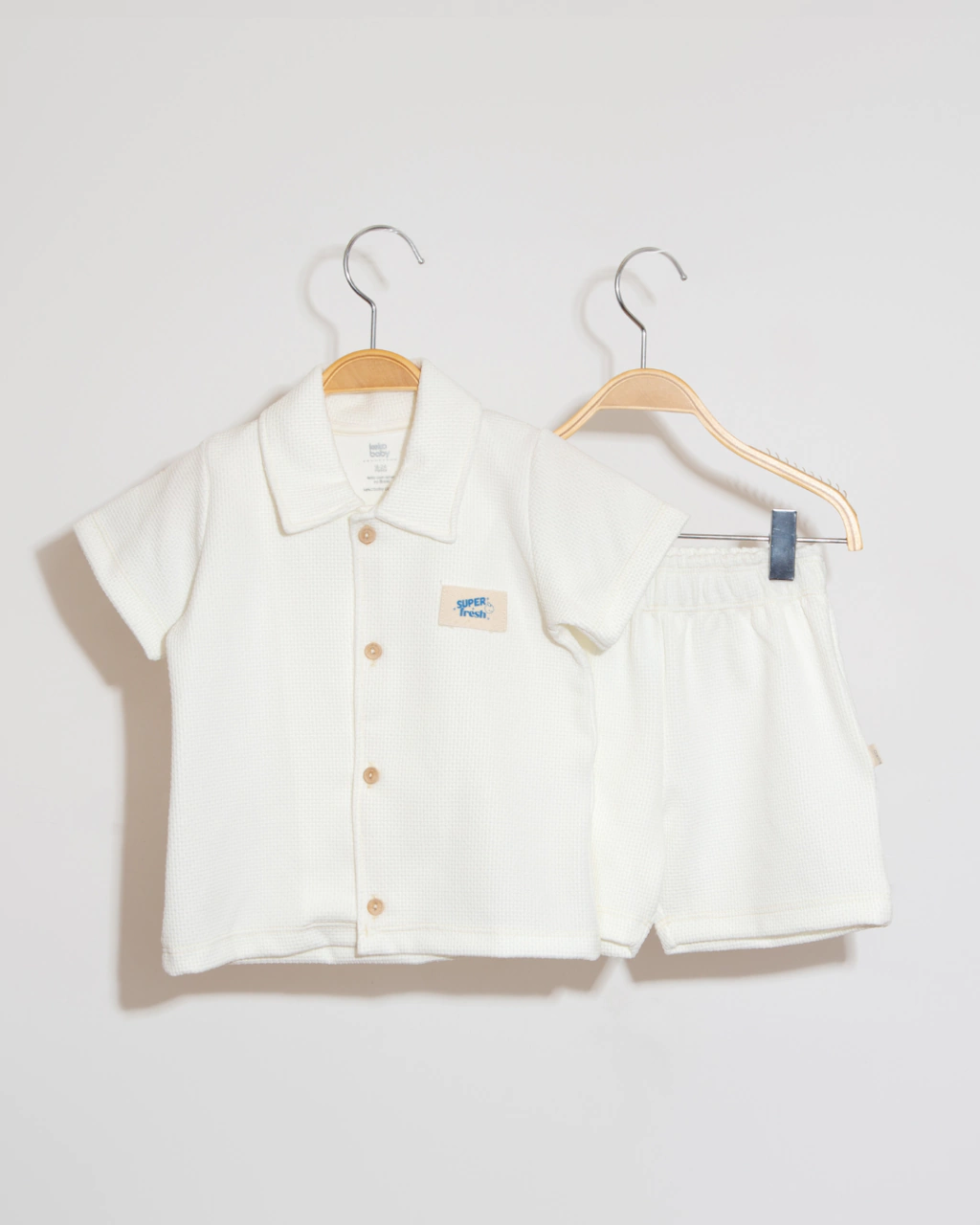 Minimalista e sofisticado, este conjunto infantil traz a elegância do off-white em um visual super leve e confortável. A camisa em tecido macio possui fechamento frontal por botões e detalhe bordado “super fresh”, reforçando o estilo casual chic da peça.