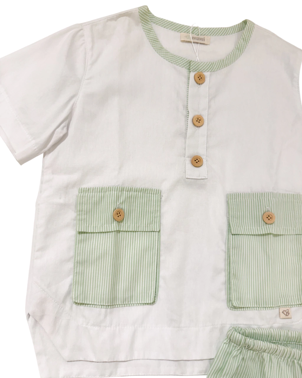 A camisa branca traz bolsos e gola com tecido listrado verde, além de botões amadeirados que dão um toque natural e delicado à peça.