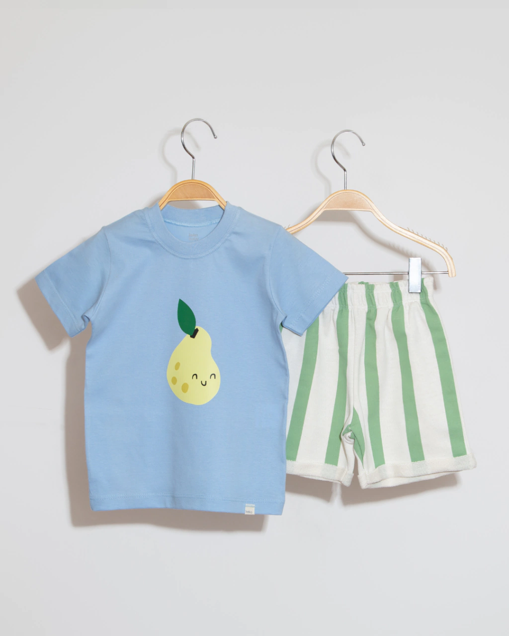 A camiseta azul em malha 100% algodão traz estampa de uma pêra sorridente que adiciona um toque lúdico e alegre ao visual. A bermuda em moletinho, com listras verdes e fundo cru, garante um caimento leve e confortável, perfeito para acompanhar os pequenos em todas as aventuras do dia. Ideal para passeios, brincadeiras e momentos cheios de estilo e diversão!