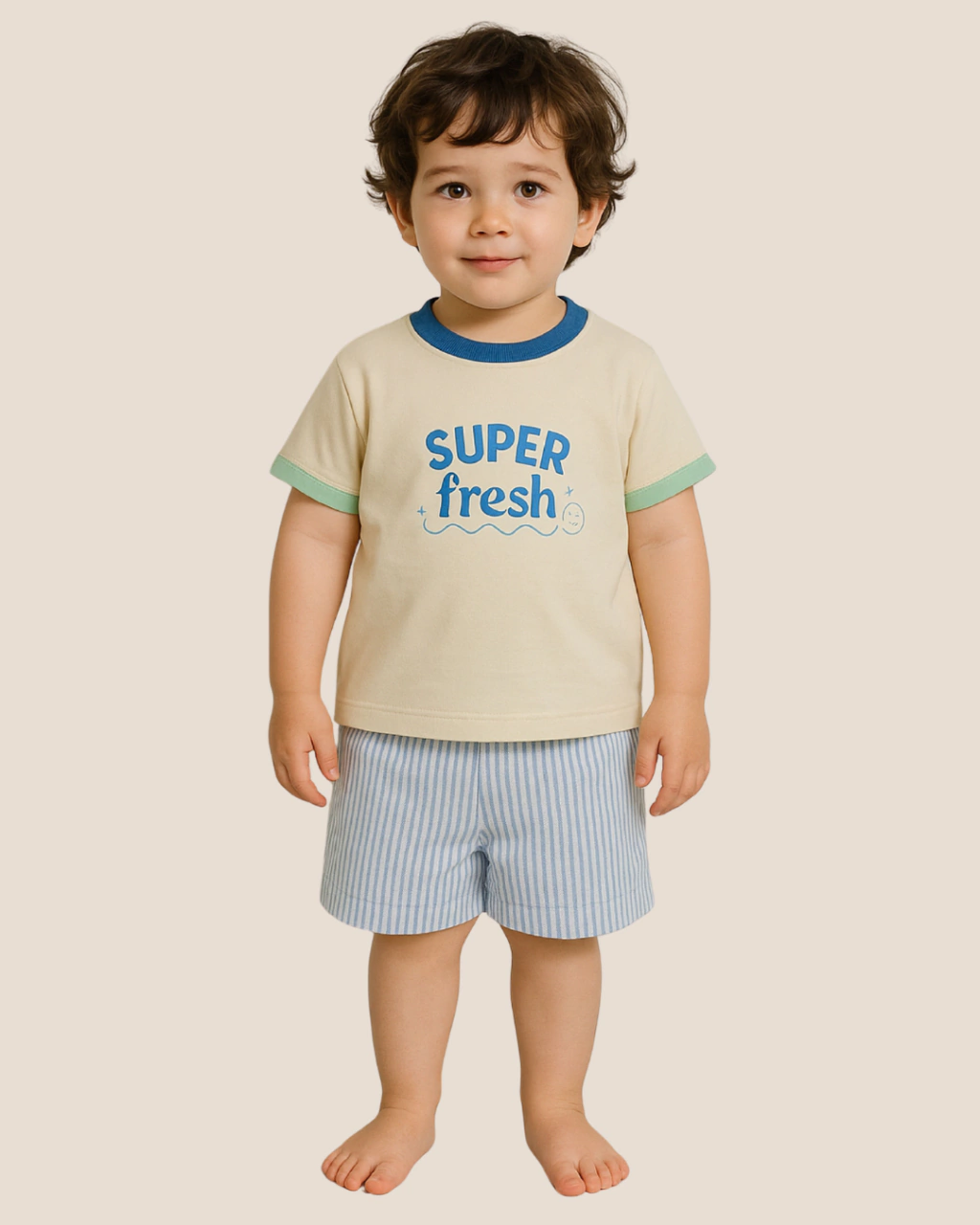 Um look fresquinho e cheio de estilo para os dias de calor! A camiseta é confeccionada em malha 100% algodão, super macia e confortável para a pele delicada da criança. Com estampa frontal "SUPER fresh", traz um ar divertido e moderno.