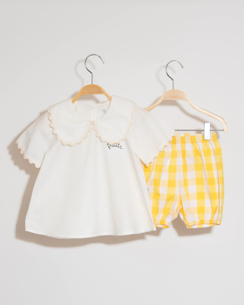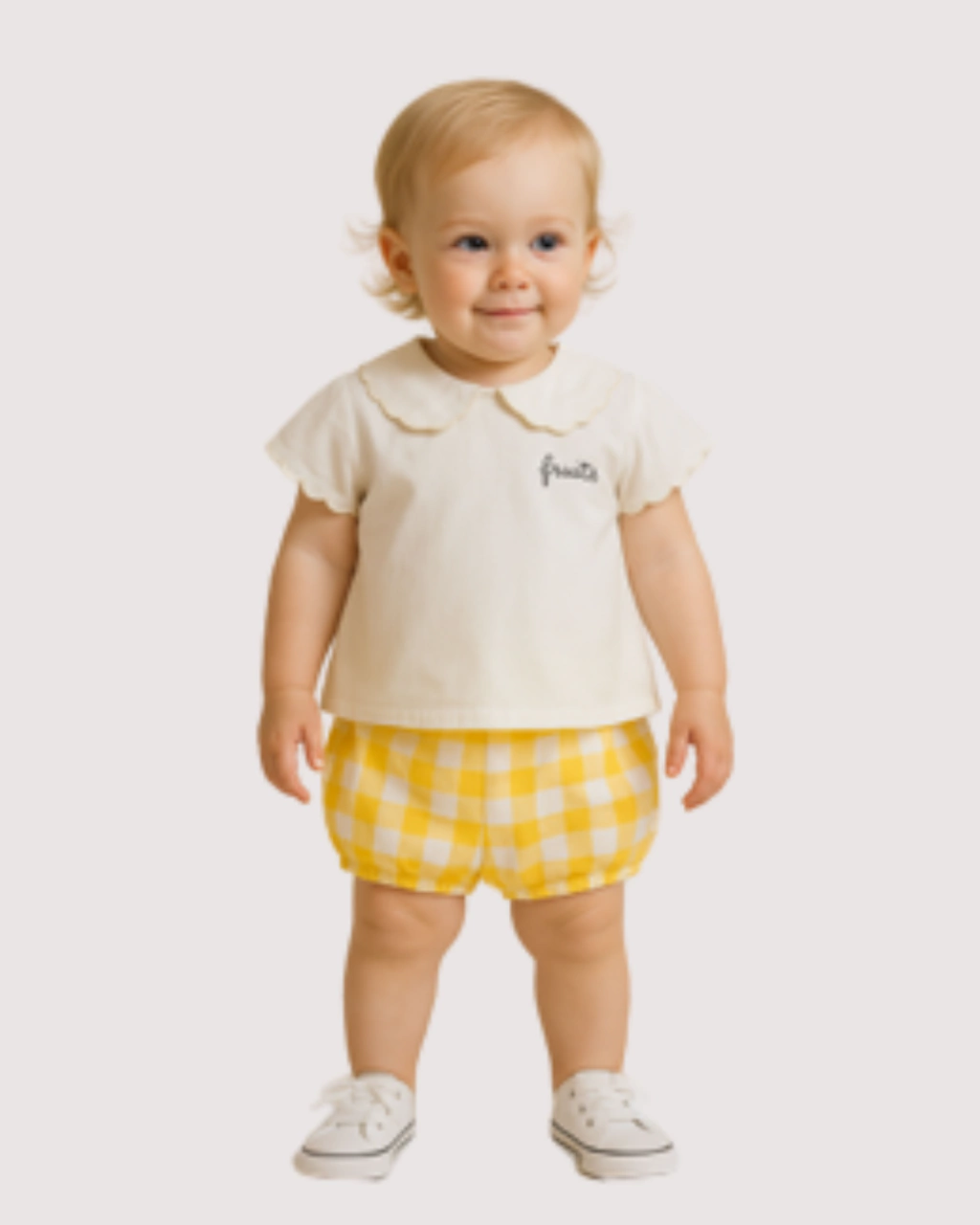 A blusa off-white conta com gola redonda com acabamento ondulado e sianinha, com bordado “fruits”, trazendo um toque lúdico e artesanal. O shorts bombachinha em vichy amarelo adiciona cor e frescor ao visual, garantindo conforto e liberdade para os movimentos das pequenas. Ideal para passeios e ocasiões especiais, este conjunto une charme e conforto na medida certa.