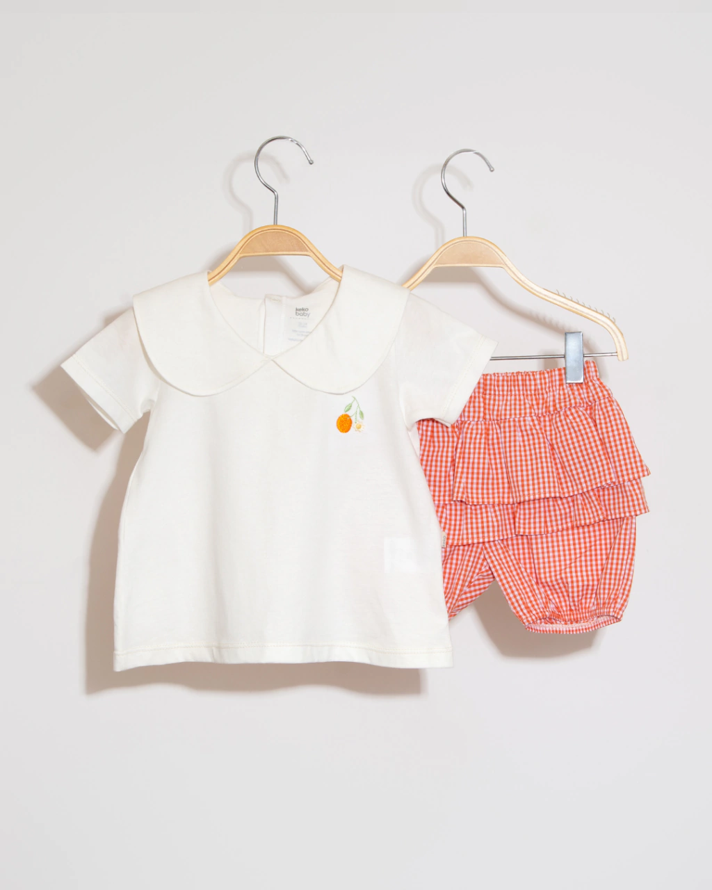 Este conjunto conta com uma blusa off-white com gola redonda e bordado de frutinha, trazendo um toque artesanal e delicado. O destaque fica por conta do shorts bombachinha em tecido vichy laranja, com camadas de babados que adicionam movimento e charme ao visual. Confeccionado em algodão macio, é perfeito para passeios, festas e momentos especiais, garantindo conforto e muito estilo para as pequenas.