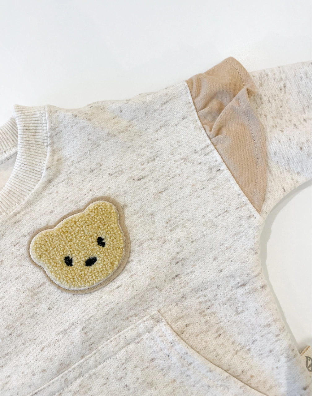 Um look lúdico, confortável e cheio de personalidade. Esse conjunto infantil em moletom e malha é perfeito para acompanhar as pequenas em todos os momentos do dia com muito estilo. A blusa mescla claro possui bolso canguru, babadinhos nos ombros em tom caramelo e um adorável patch de ursinho em bouclé aplicado no peito — detalhe que conquista à primeira vista. A calça em malha na mesma paleta traz conforto com cintura e barras em elástico, ideal para a rotina das crianças.