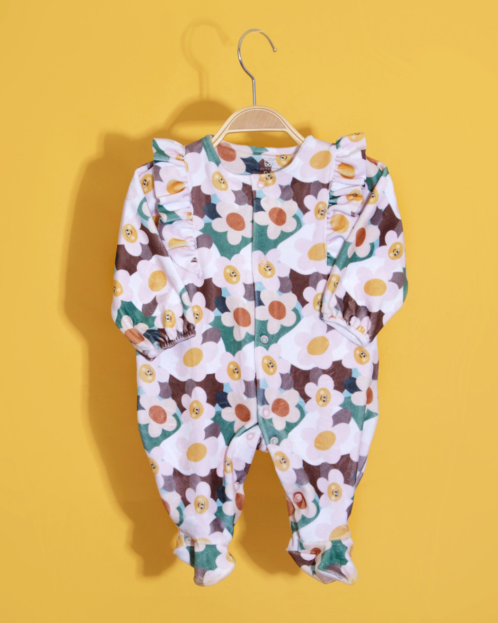 Estilo, conforto e muita fofura em uma única peça! Este macacão em plush é perfeito para os dias mais fresquinhos, oferecendo um toque macio e quentinho na pele do bebê. Com estampa floral divertida em tons terrosos, verdes e amarelos, traz carinhas sorridentes no miolo das flores que encantam e alegram o visual.