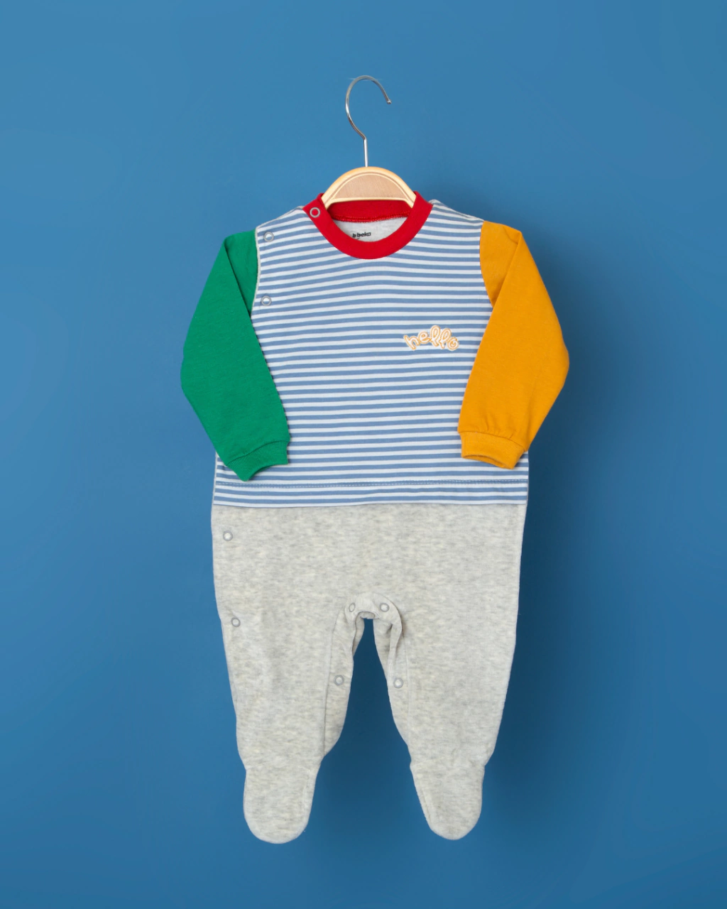 Um look divertido e super confortável! Esse conjunto é composto por uma camiseta em malha listrada com mangas longas coloridas, trazendo um toque alegre e moderno ao visual. O macacão em plush completa o look com muito aconchego, ideal para os dias mais fresquinhos.