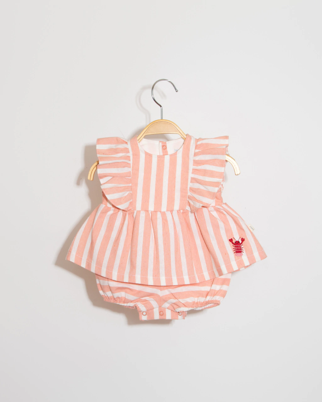 Confeccionado em tecido estilo linho, este macacão combina conforto e sofisticação. O modelo traz listras em tom suave, babadinhos nos ombros e saia sobreposta, criando um efeito de vestidinho super fofo. Na lateral, o bordado de lagosta dá um toque divertido e exclusivo à peça.