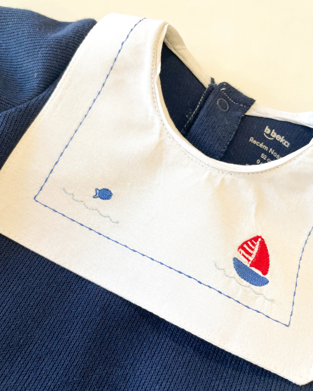 A gola bordada com acabamento refinado e a estampa de barquinhos trazem um charme lúdico e delicado, remetendo a aventuras leves e sonhadoras. O modelo conta com pezinho fechado e abertura por botões de pressão nas costas e entre as perninhas, facilitando na hora de vestir e nas trocas. Um item prático, fofo e cheio de estilo para o enxoval do bebê.