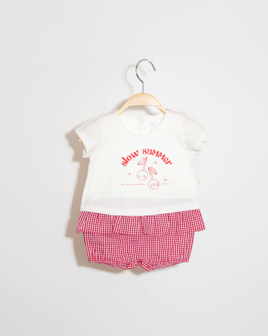 A aprte que emita a blusa é em malha conta com estampa cerejinha "slow summer", trazendo um toque lúdico e divertido. O shorts bombachinha em vichy vermelho adiciona cor e frescor ao visual, garantindo conforto e liberdade para os movimentos das pequenas. Ideal para passeios e ocasiões especiais, este conjunto une charme e conforto na medida certa.