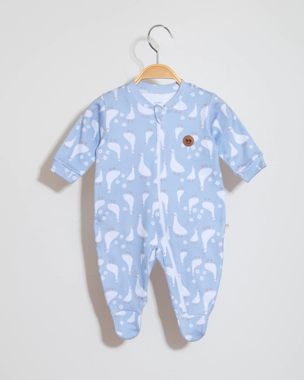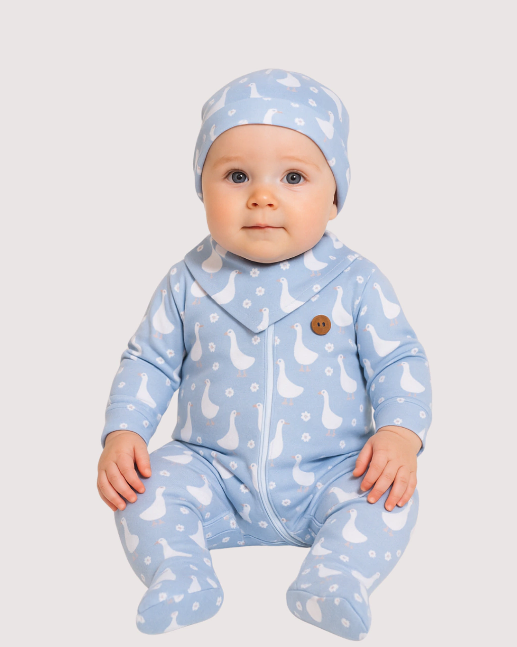 A estampa digital traz patinhos brancos sobre fundo azul claro, em um desenho lúdico e encantador que combina com a leveza da infância.