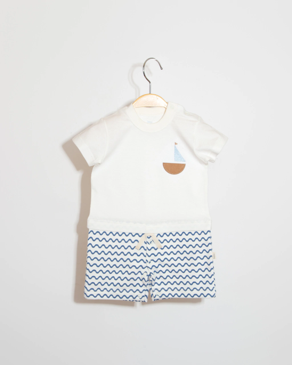 A parte superior off-white é decorada com um delicado aplique de barquinho, enquanto a parte inferior simula um shortinho estampado com ondas azuis, criando um visual náutico cheio de personalidade.