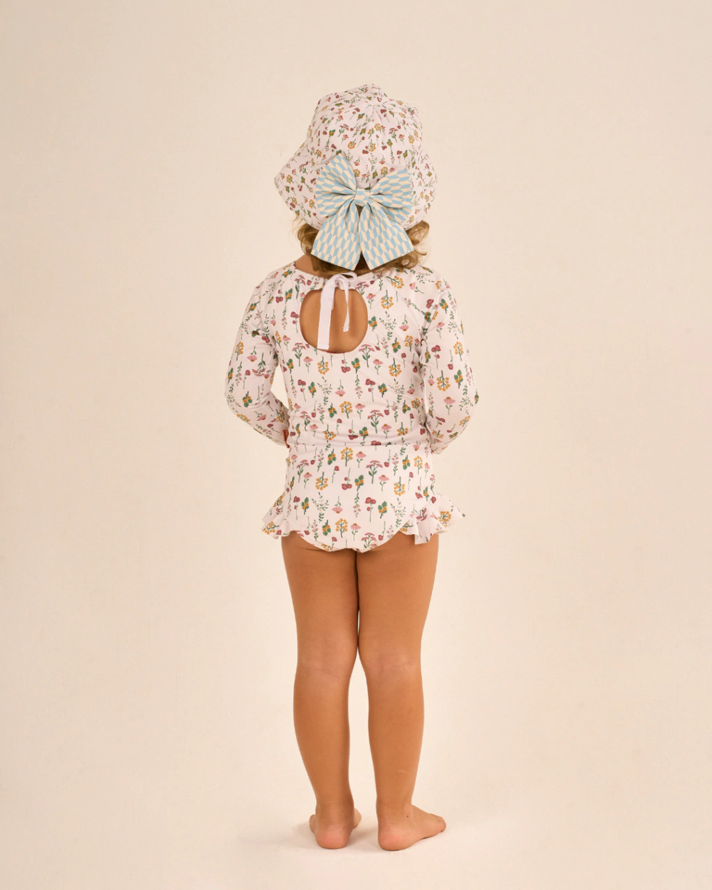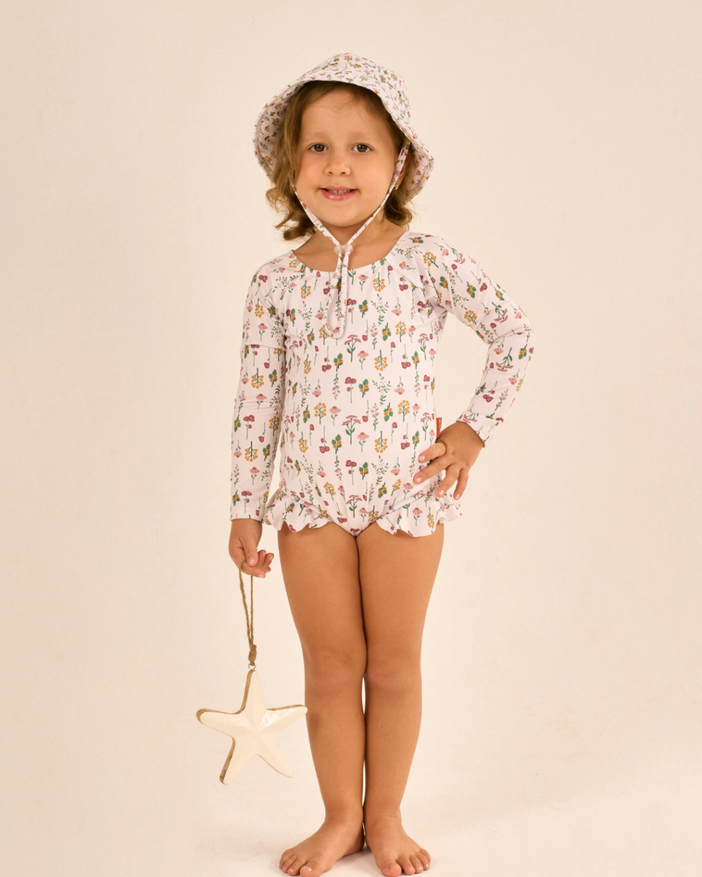 A estampa floral exclusiva traz leveza e encanto à peça, que conta com mangas longas e babadinhos suaves nas pernas fazendo um mix de estampas perfeito, combinando proteção e charme na medida certa.