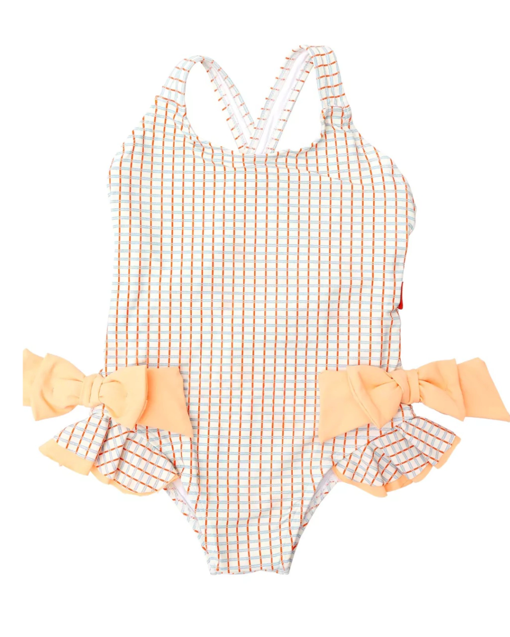 Modelo regata com fechamento em X e detalhes em laços na cor Peach nas laterais da calcinhas para um verão de muita diversão.