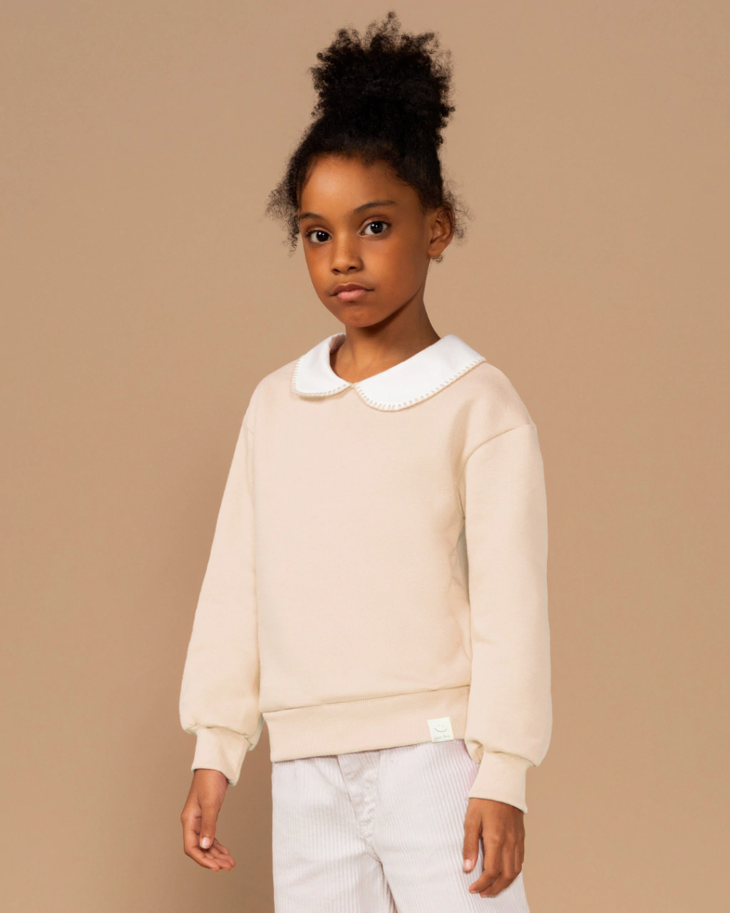 Um toque de charme clássico com o aconchego que a gente adora! O moletom bege com gola Peter Pan é a peça perfeita para unir estilo e conforto no dia a dia das pequenas. Confeccionado em tecido encorpado com toque suave, tem composição 50% algodão e 50% poliéster — equilibrando maciez e durabilidade.