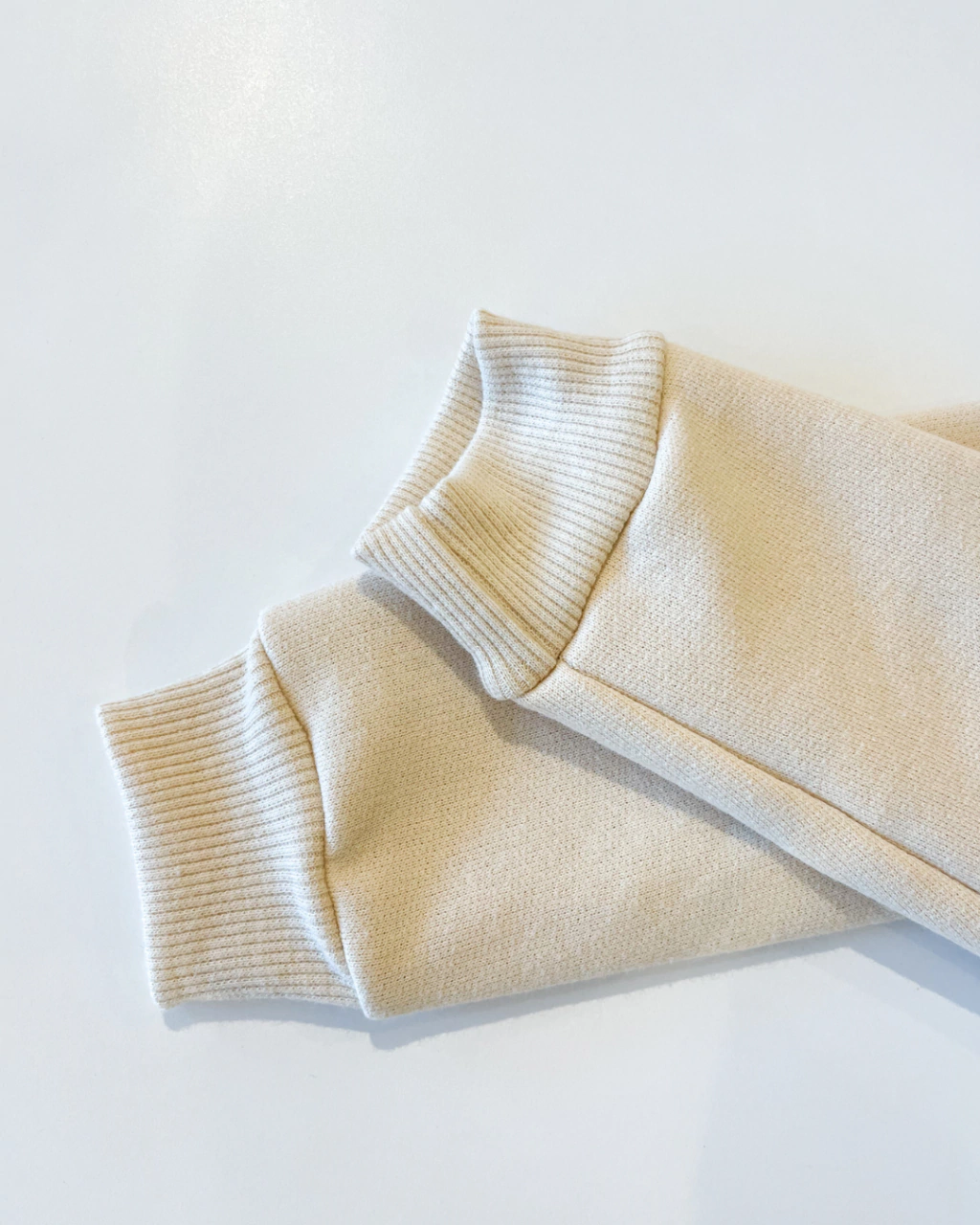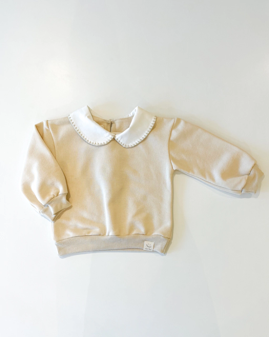 O diferencial fica por conta da gola Peter Pan branca com acabamento delicado, que dá um ar romântico e sofisticado à peça. A modelagem é levemente ampla, com mangas bufantes e punhos ajustados para um caimento moderno e confortável. A barra é reta e canelada, garantindo que o moletom fique no lugar sem apertar.