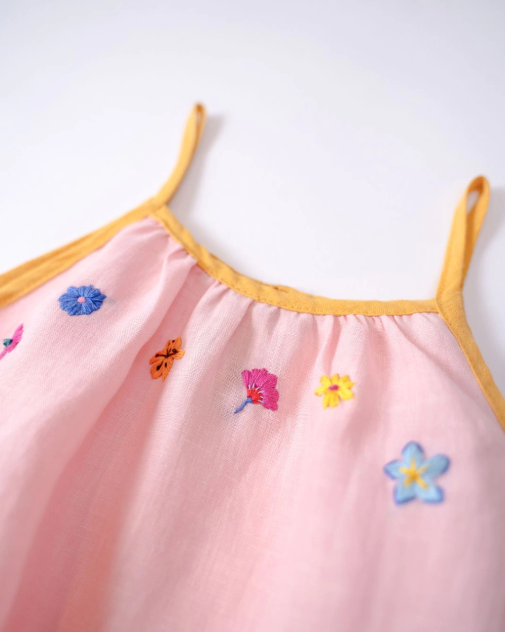 Delicadeza e conforto em uma só peça! Esse romper é confeccionado em 100% linho, tecido leve e fresco, perfeito para os dias mais quentes. O destaque fica por conta do bordado feito à mão, que traz o charme das flores, adicionando um toque lúdico e especial.