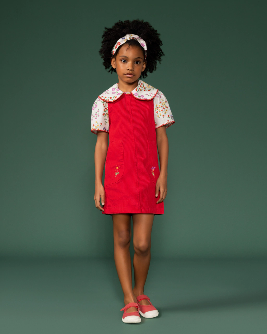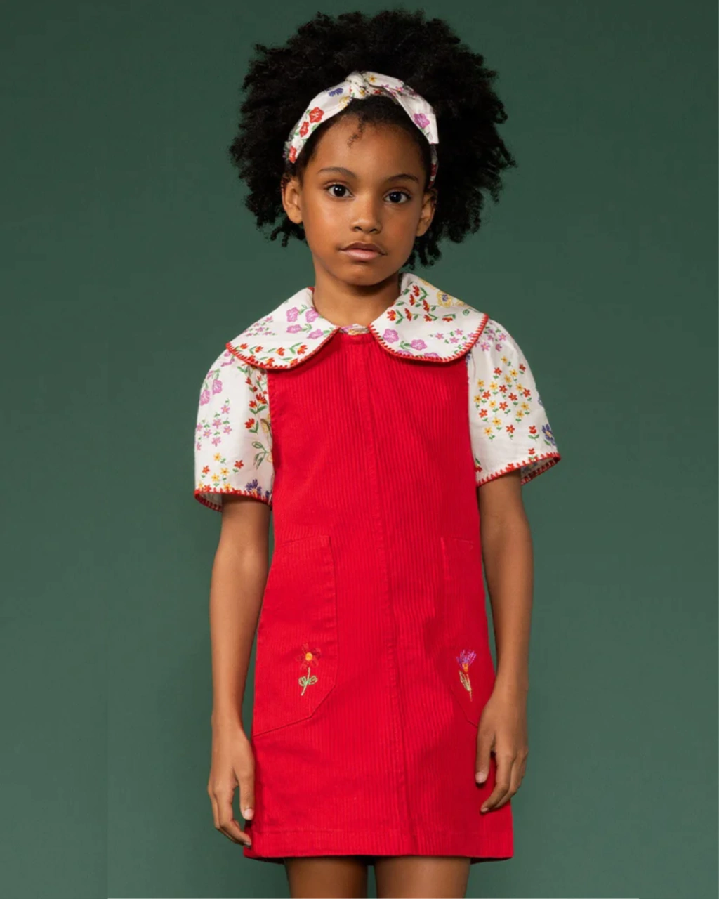 Essa salopete vermelha em sarja cotelê é puro charme e conforto, perfeita para as pequenas exploradoras que adoram flores, cores e aventuras.