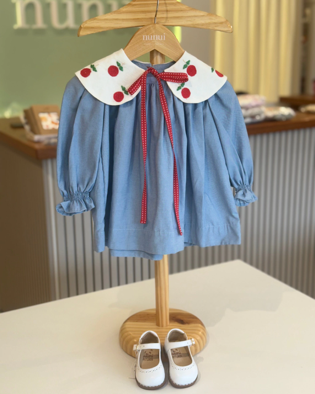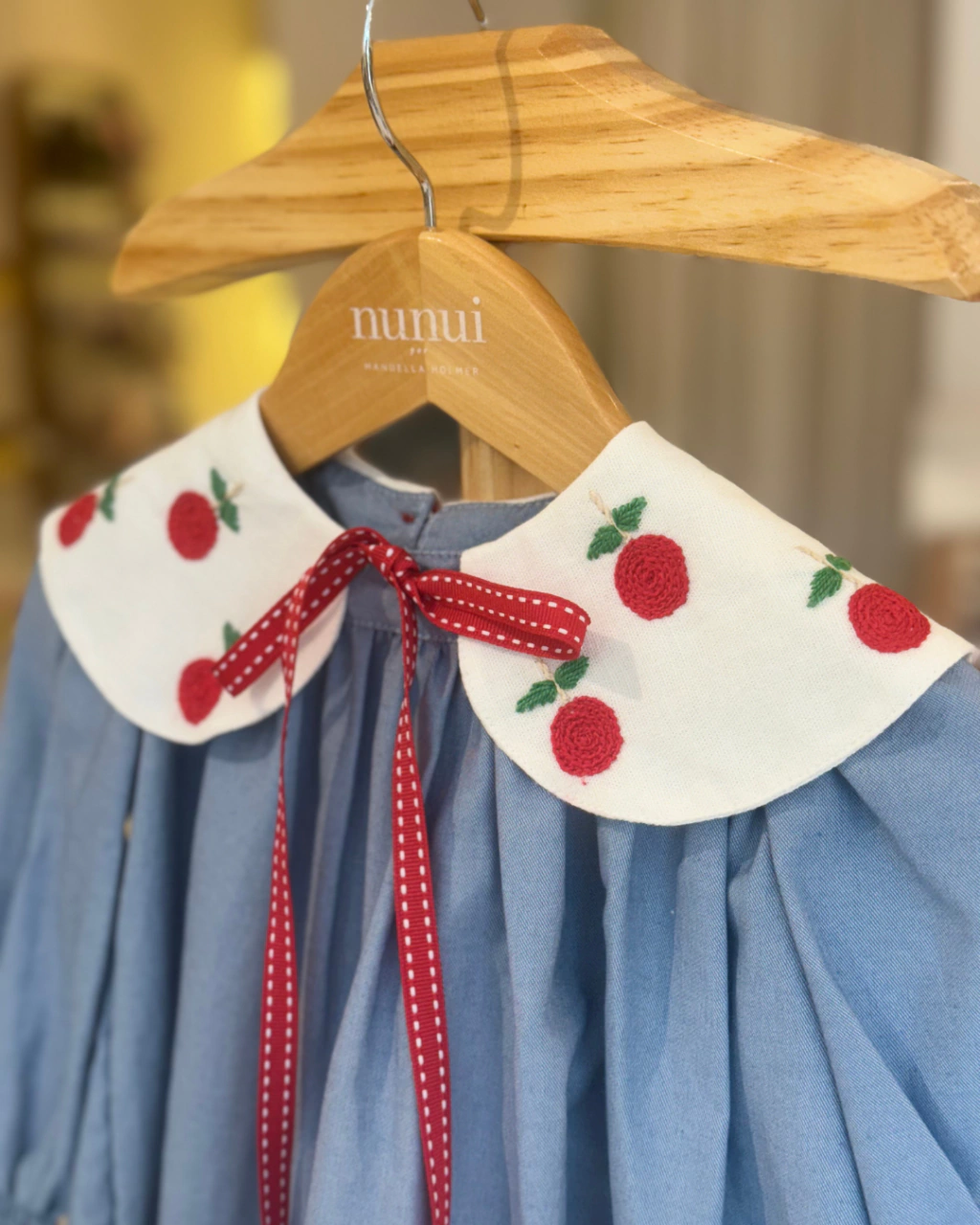 O destaque fica por conta da gola ampla branca, com delicados bordados de cerejinhas vermelhas e folhas verdes — um detalhe feito à mão que transforma a peça em algo verdadeiramente especial. O laço em fita de poá vermelho complementa o look com um toque vibrante.