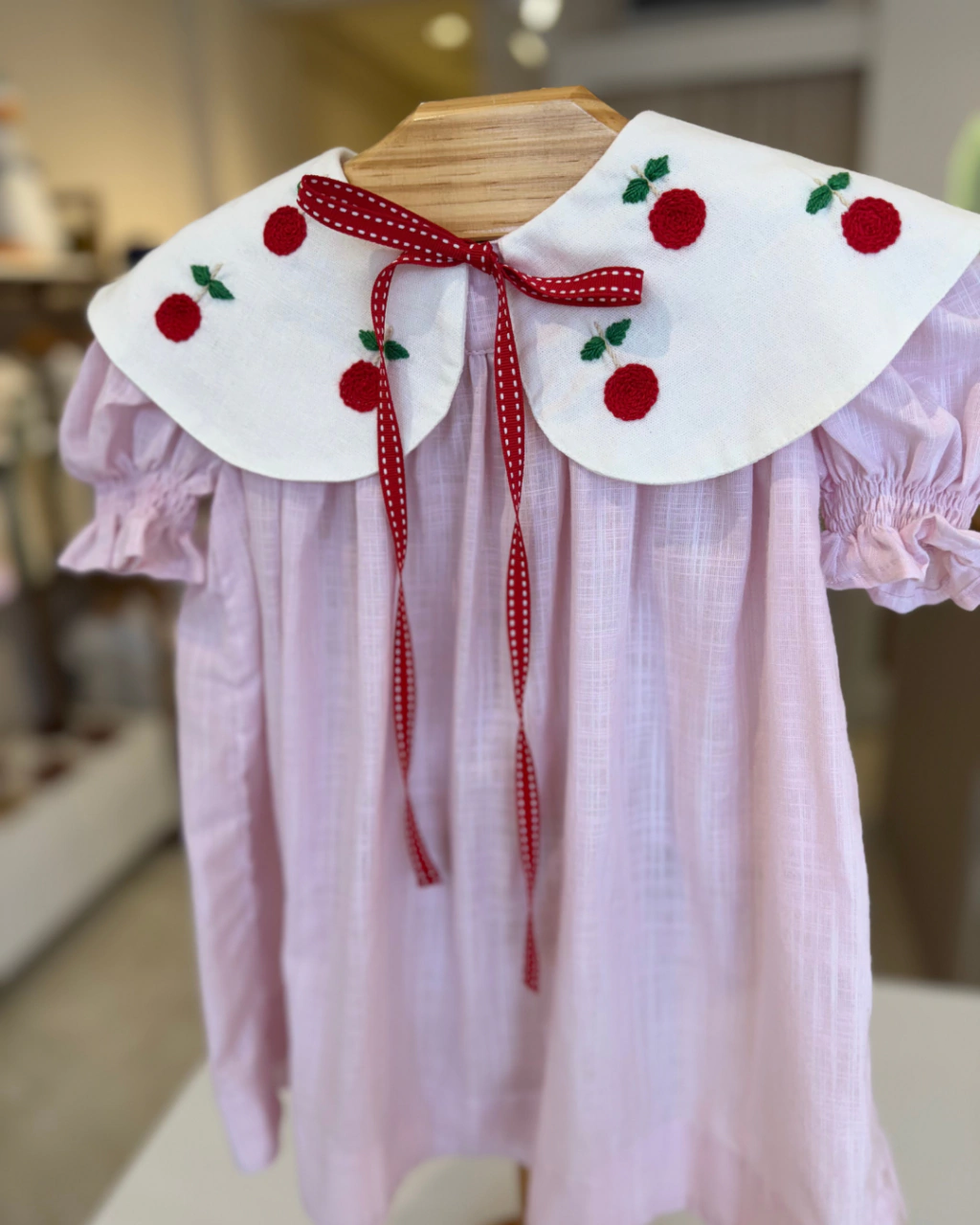 O Vestido Cherry Rosa Bebê é a escolha ideal para quem busca uma peça delicada, elegante e artesanal. Confeccionado em tecido de alta qualidade no tom suave de rosa bebê, ele se destaca pelo bordado à mão na gola, com pequenas cerejinhas vermelhas que trazem um charme único e sofisticado.