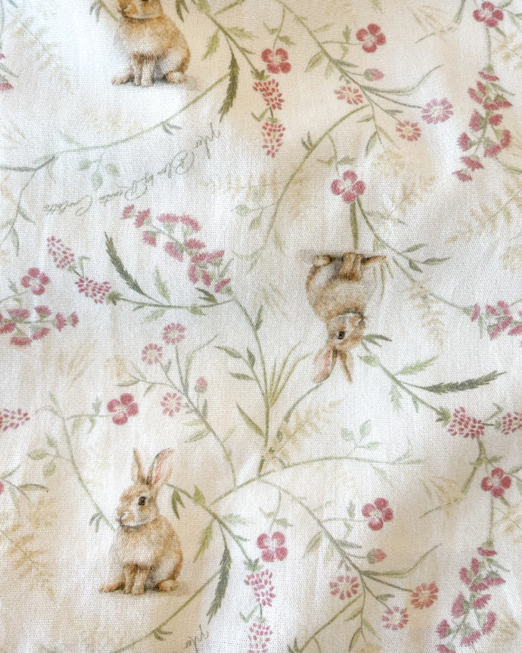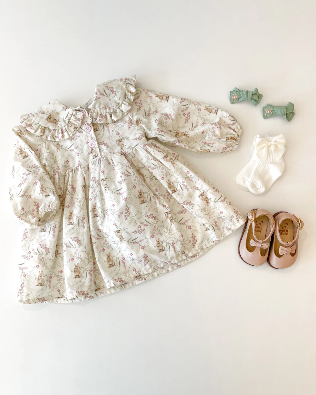 O Vestido Coelhinhos tem comprimento tradicional, é confeccionado em tecido tricoline 100% Algodão, com estampa digital exclusiva Mer Bleu. Possui busto com abertura frontal com botões de madeira. A peça conta com gola de babado e mangas longas com elástico no punho.