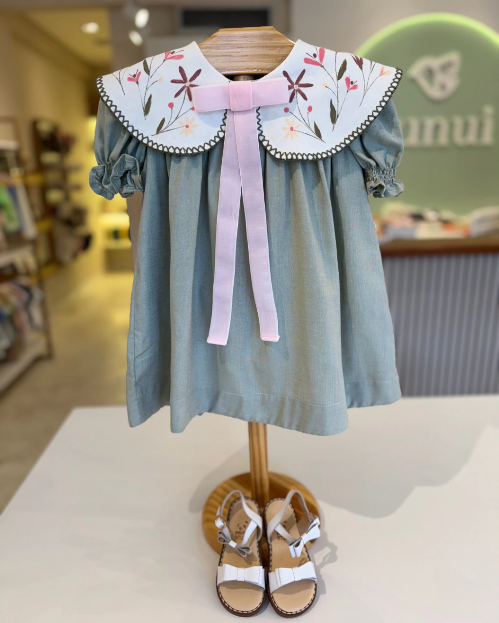 Este vestido em verde cana destaca-se pela gola pintada à mão com flores, um detalhe artesanal que confere exclusividade e sofisticação à peça. O laço de veludo rosa bebê finaliza o design com um toque suave e feminino, perfeito para ocasiões que pedem charme e requinte.
