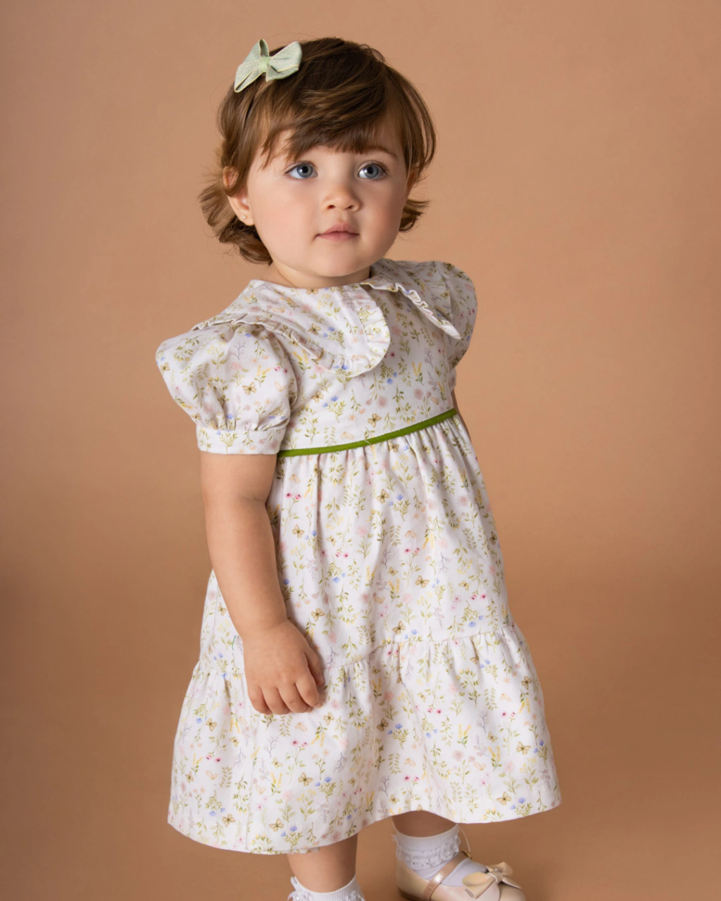 Um verdadeiro encanto em forma de vestido! Com uma estampa delicada de flores e borboletas, este modelo convida as pequenas a passearem por um jardim mágico e colorido. A golinha boneca e as manguinhas bufantes trazem um toque romântico e retrô, com uma modelagem atemporal que nunca sai de moda.