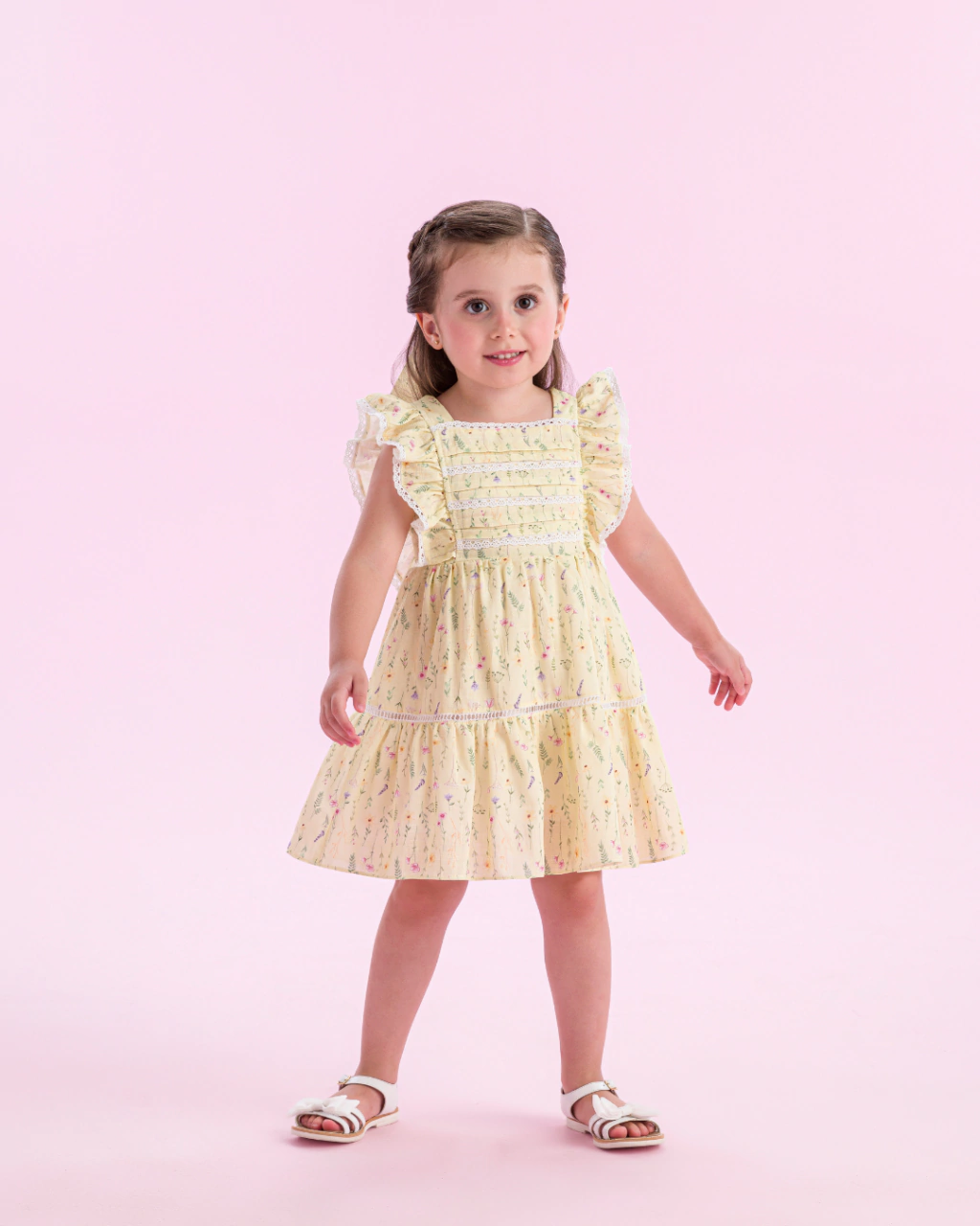 Vestido infantil em tom amarelo claro com estampa floral delicada, confeccionado em tecido leve e macio.