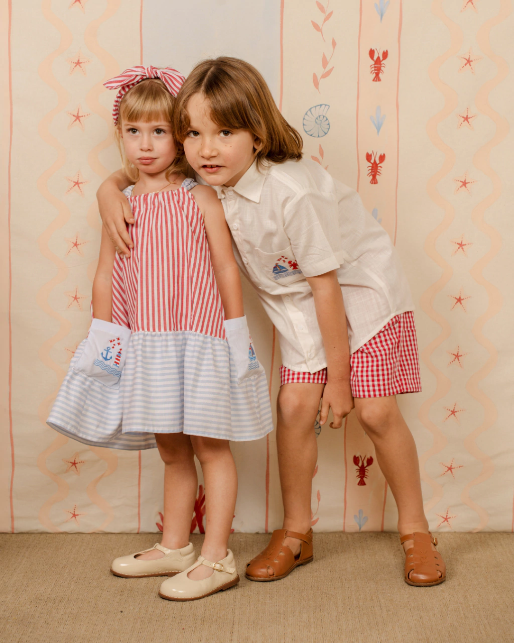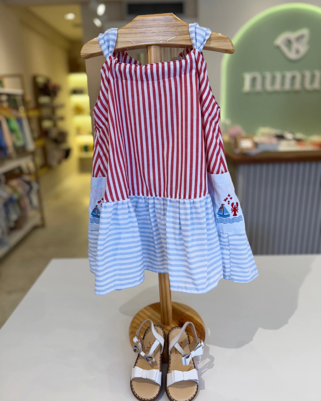 Com listras em composê azul e vermelho, este vestido leve traz bordados delicados de lagosta nos bolsinhos laterais, que dão um toque exclusivo e divertido.