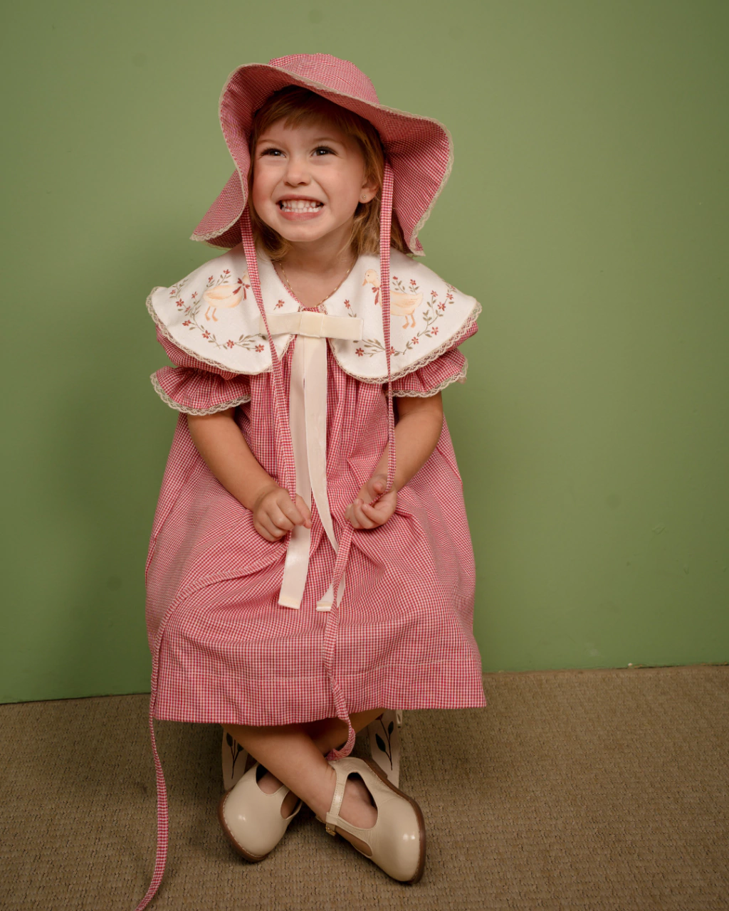 A gola pintada à mão com patinhos e flores confere um toque artístico e exclusivo, enquanto os detalhes em renda cru na gola e nas mangas adicionam sofisticação e delicadeza ao design. Para completar, um laço de fita cuidadosamente posicionado traz um charme extra, valorizando o visual com sutileza.