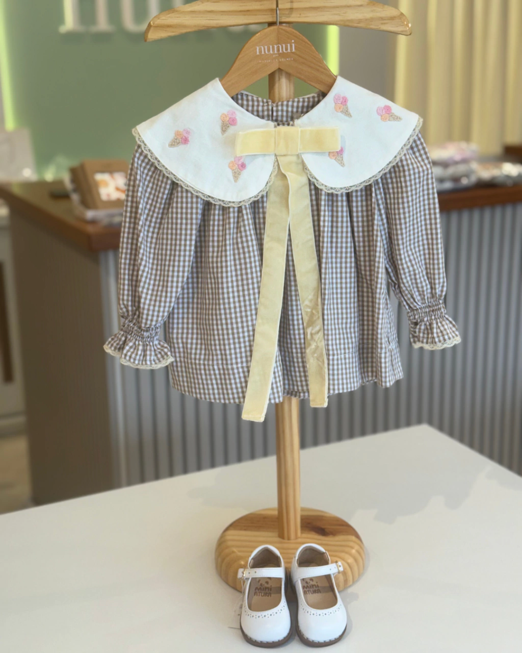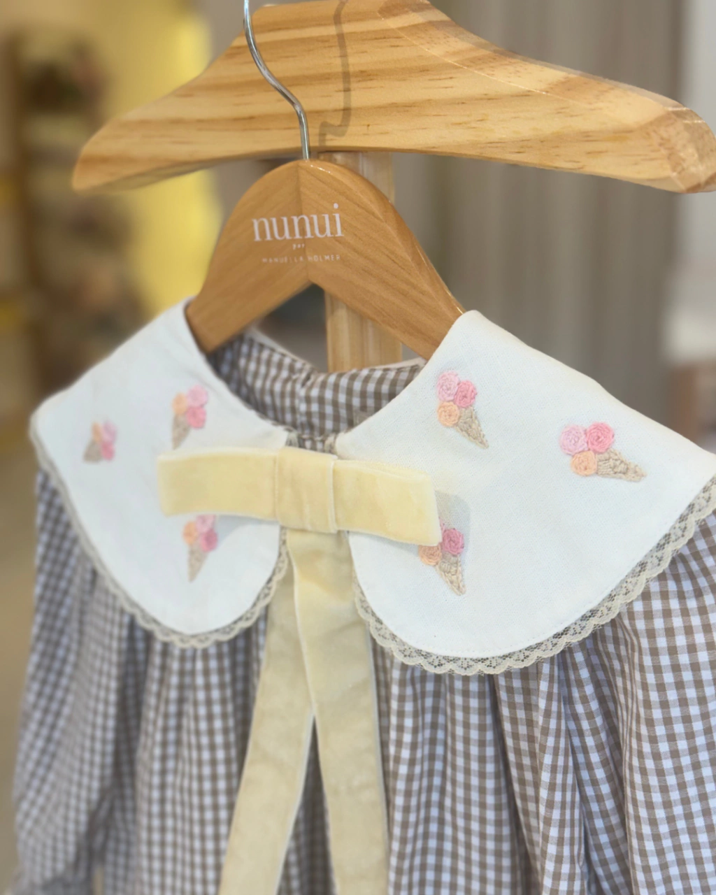 Um toque retrô com uma pitada de doçura. Este vestido da Nunui combina o charme clássico do xadrez marrom com a delicadeza divertida dos bordados manuais em forma de sorvetinhos.