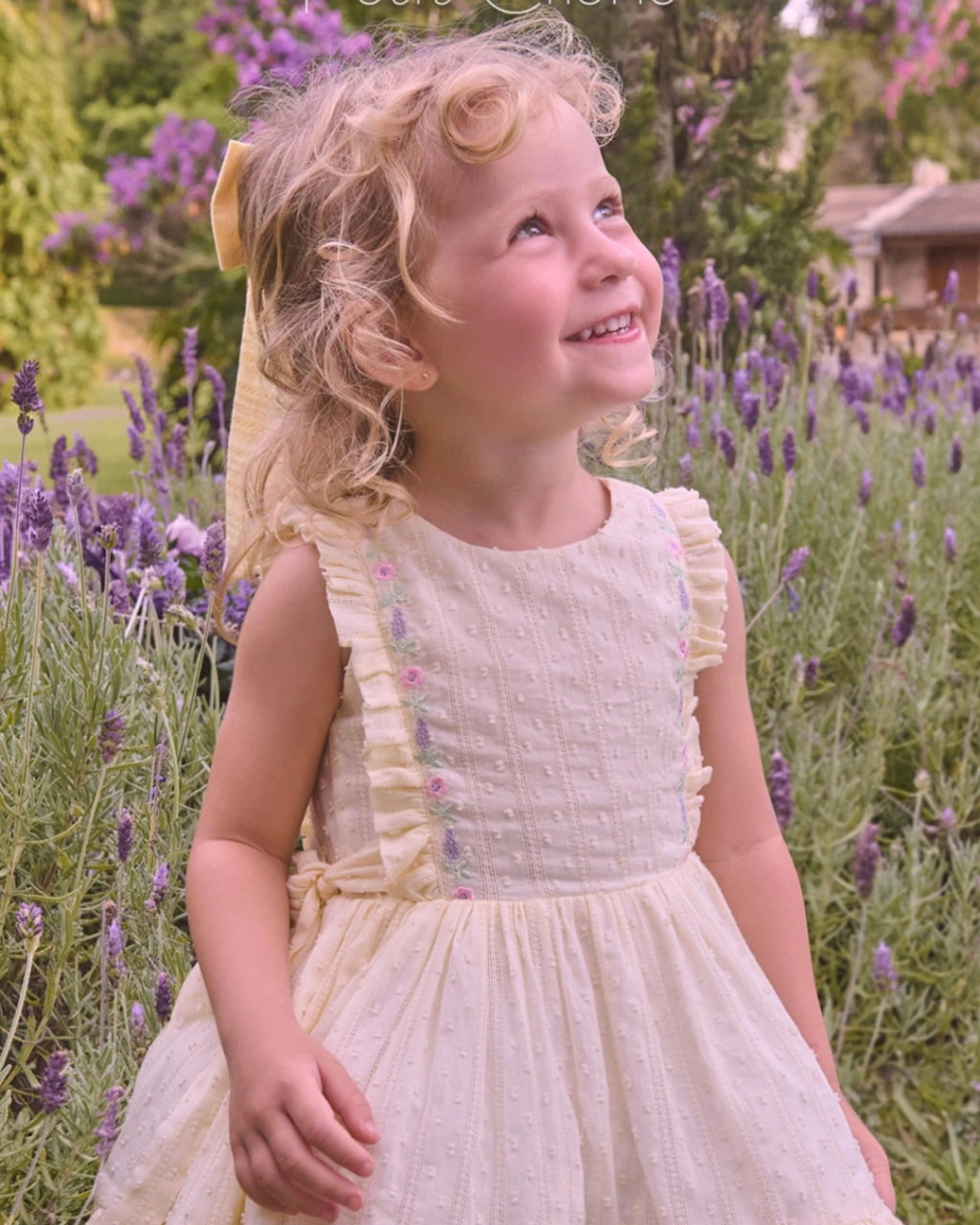 Vestido infantil em tom amarelo suave, confeccionado em tecido leve com textura poá.